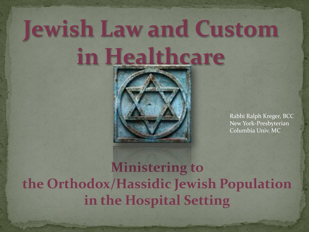 Jewish Law and Custom in Healthcare Rabbi Ralph Kreger, BCC New York-Presbyterian Columbia Univ. MC Ministering to the Orthodox/Hassidic Jewish Population in the Hospital Setting