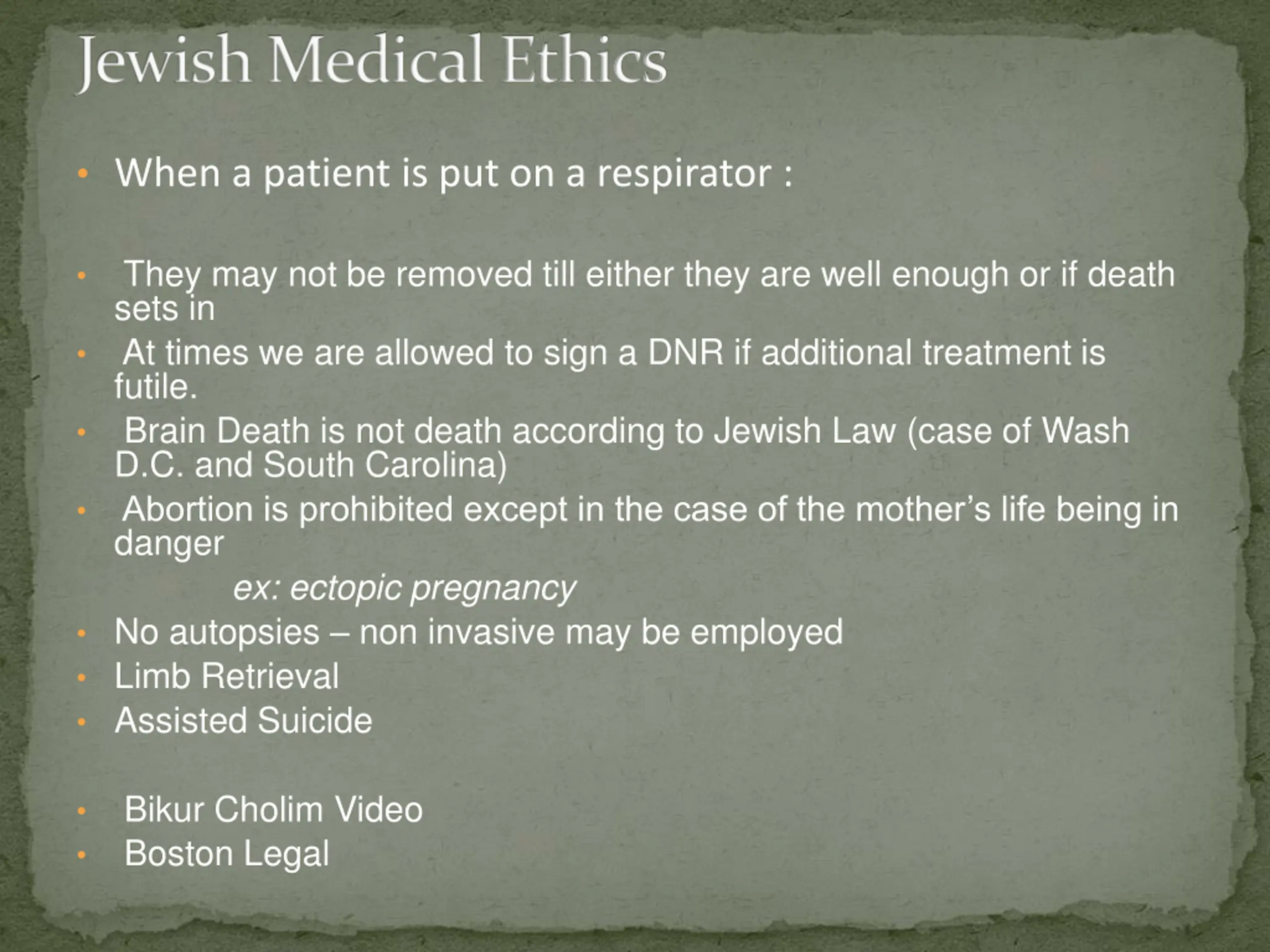 Jewish Medical Ethics When a patient is put on a respirator : They may not be removed till either they are well enough or if death sets in At times we are allowed to sign a DNR if additional treatment is futile. Brain Death is not death according to Jewish Law (case of Wash D.C. and South Carolina) Abortion is prohibited except in the case of the mother s life being in danger ex: ectopic pregnancy No autopsies non invasive may be employed Limb Retrieval Assisted Suicide Bikur Cholim Video Boston Legal