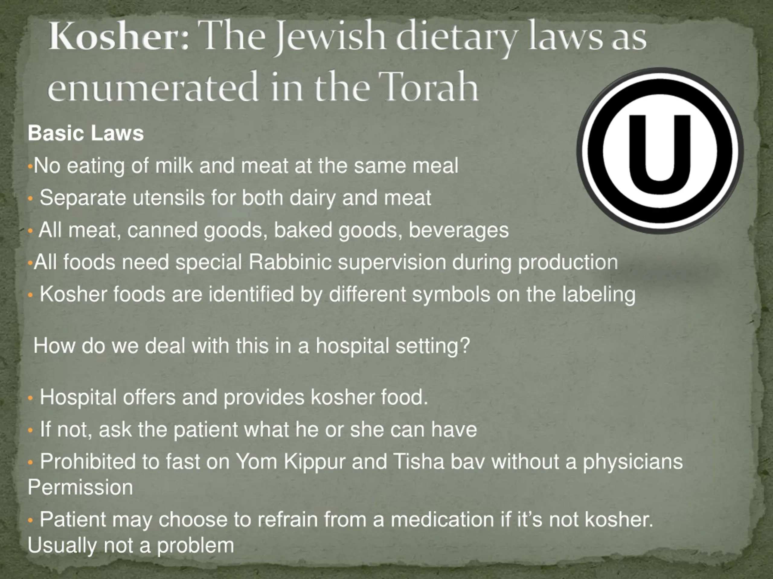 Kosher: The Jewish dietary laws as enumerated in the Torah Basic Laws No eating of milk and meat at the same meal Separate utensils for both dairy and meat All meat, canned goods, baked goods, beverages All foods need special Rabbinic supervision during production Kosher foods are identified by different symbols on the labeling How do we deal with this in a hospital setting? Hospital offers and provides kosher food. If not, ask the patient what he or she can have Prohibited to fast on Yom Kippur and Tisha bav without a physicians Permission Patient may choose to refrain from a medication if it s not kosher. Usually not a problem