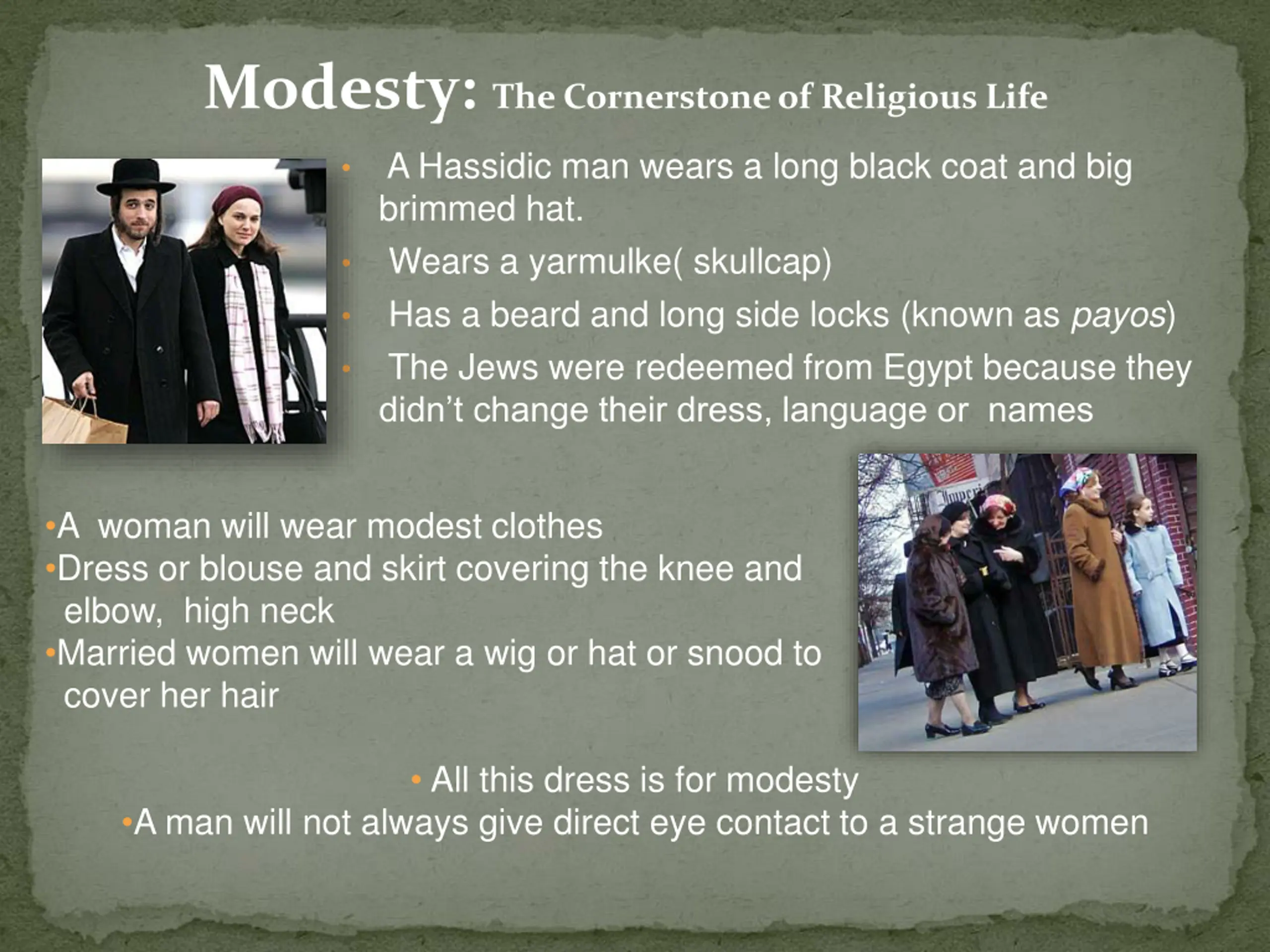Modesty: The Cornerstone of Religious Life A Hassidic man wears a long black coat and big brimmed hat. Wears a yarmulke( skullcap) Has a beard and long side locks (known as payos) The Jews were redeemed from Egypt because they didn t change their dress, language or names A woman will wear modest clothes Dress or blouse and skirt covering the knee and elbow, high neck Married women will wear a wig or hat or snood to cover her hair All this dress is for modesty A man will not always give direct eye contact to a strange women