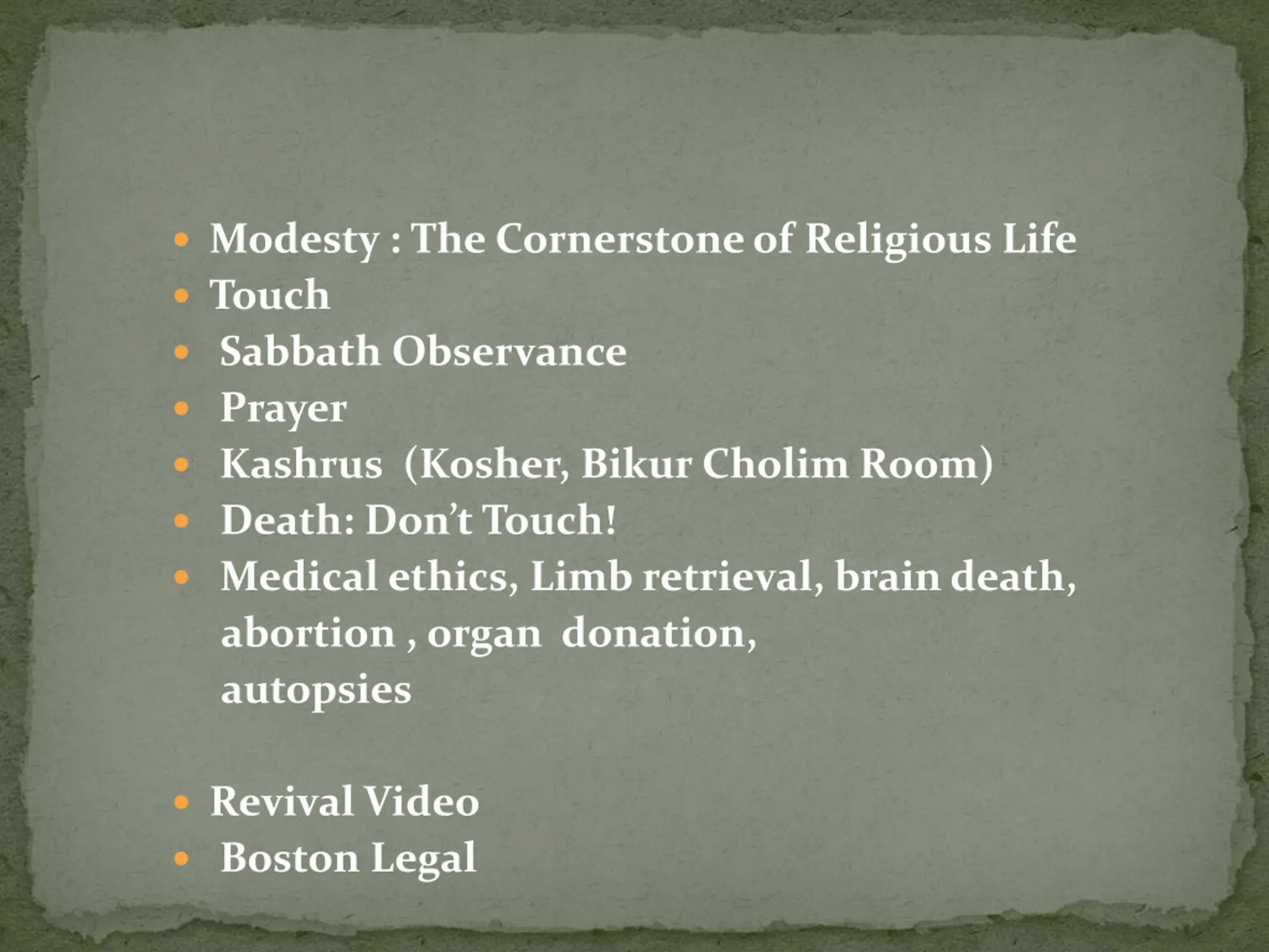Modesty : The Cornerstone of Religious Life Touch Sabbath Observance Prayer Kashrus (Kosher, Bikur Cholim Room) Death: Don t Touch! Medical ethics, Limb retrieval, brain death, abortion , organ donation, autopsies Revival Video Boston Legal