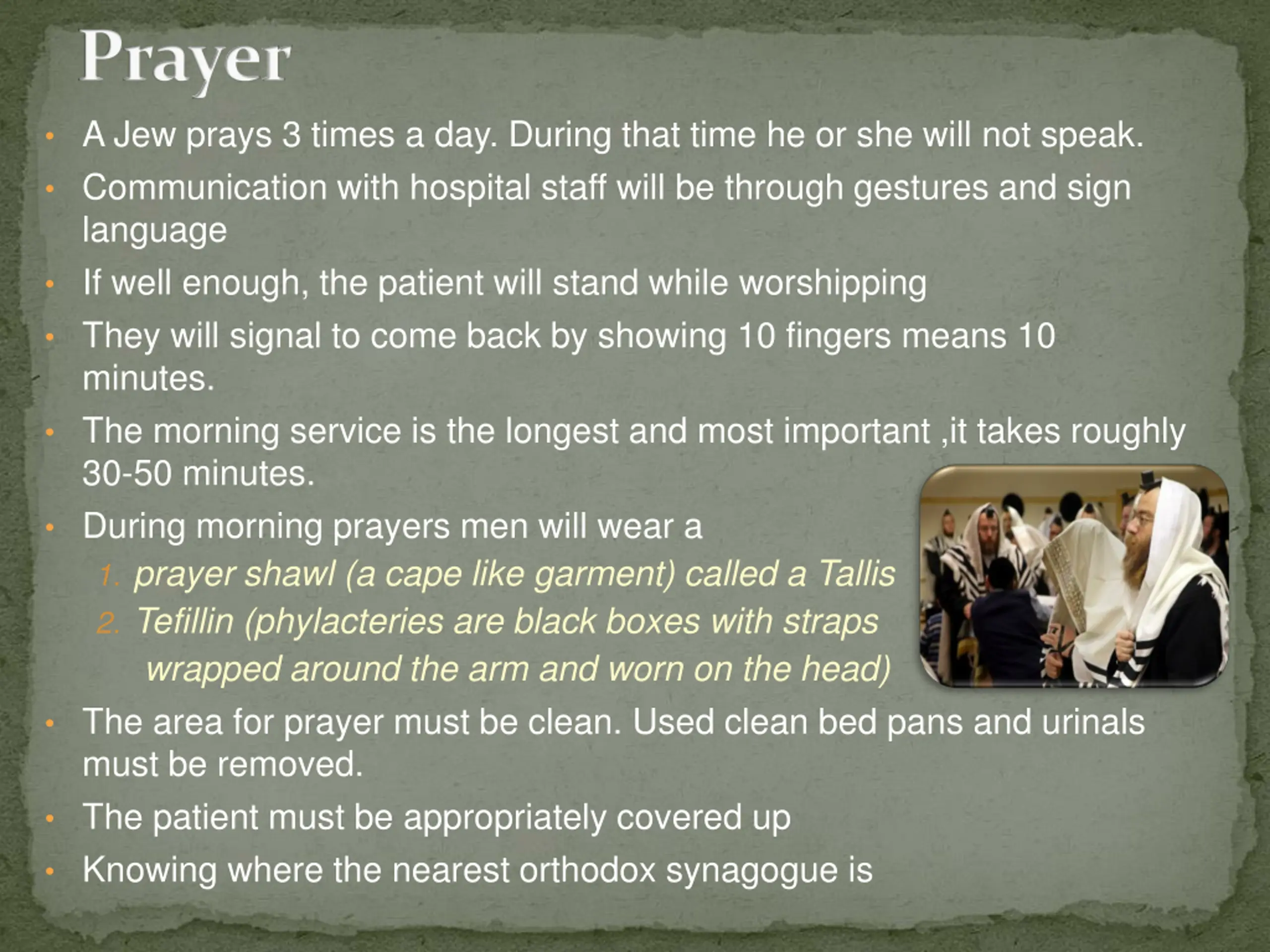 Prayer A Jew prays 3 times a day. During that time he or she will not speak. Communication with hospital staff will be through gestures and sign language If well enough, the patient will stand while worshipping They will signal to come back by showing 10 fingers means 10 minutes. The morning service is the longest and most important ,it takes roughly 30-50 minutes. During morning prayers men will wear a 1. prayer shawl (a cape like garment) called a Tallis 2. Tefillin (phylacteries are black boxes with straps wrapped around the arm and worn on the head) The area for prayer must be clean. Used clean bed pans and urinals must be removed. The patient must be appropriately covered up Knowing where the nearest orthodox synagogue is