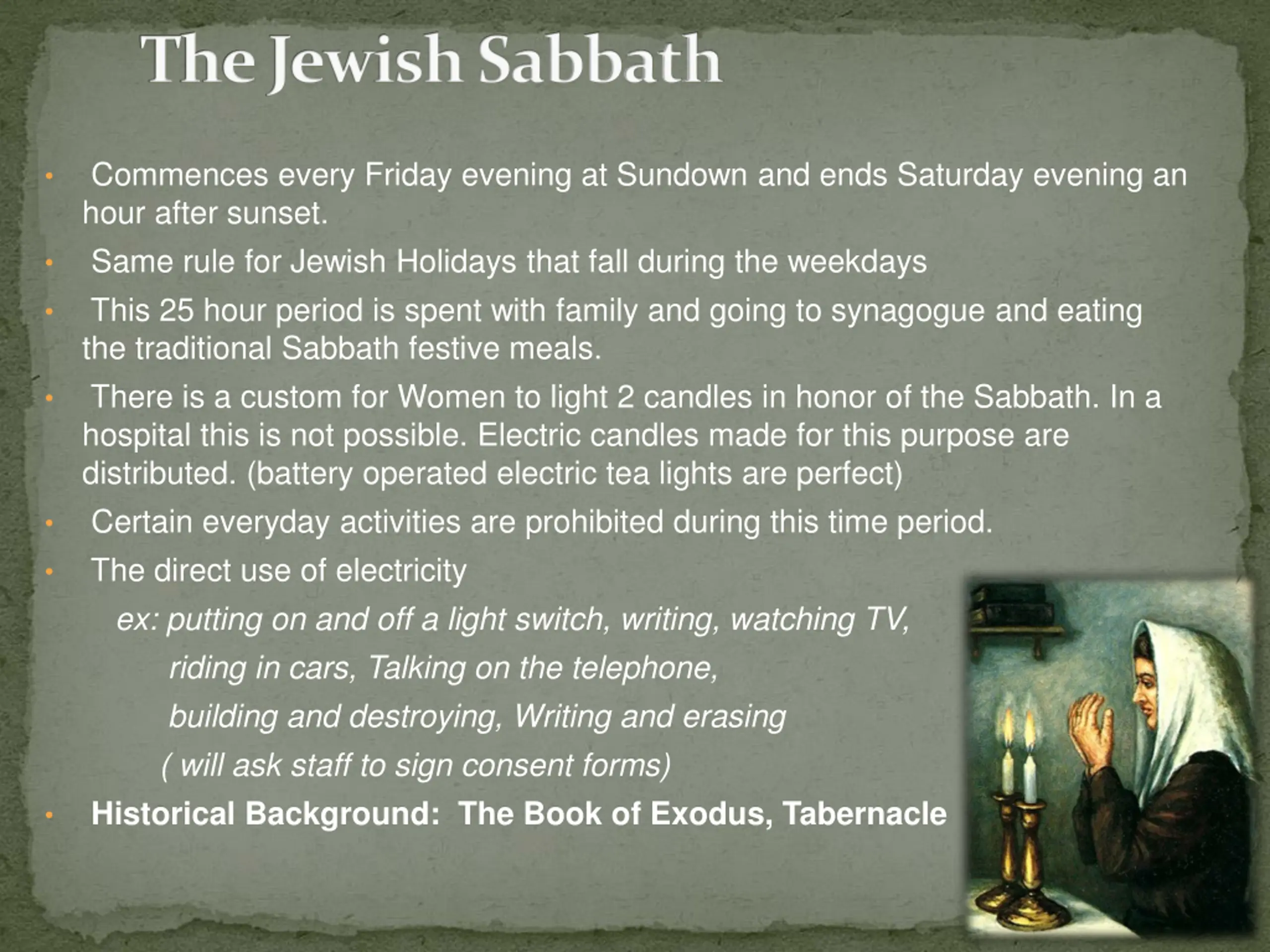 The Jewish Sabbath Commences every Friday evening at Sundown and ends Saturday evening an hour after sunset. Same rule for Jewish Holidays that fall during the weekdays This 25 hour period is spent with family and going to synagogue and eating the traditional Sabbath festive meals. There is a custom for Women to light 2 candles in honor of the Sabbath. In a hospital this is not possible. Electric candles made for this purpose are distributed. (battery operated electric tea lights are perfect) Certain everyday activities are prohibited during this time period. The direct use of electricity ex: putting on and off a light switch, writing, watching TV, riding in cars, Talking on the telephone, building and destroying, Writing and erasing ( will ask staff to sign consent forms) Historical Background: The Book of Exodus, Tabernacle