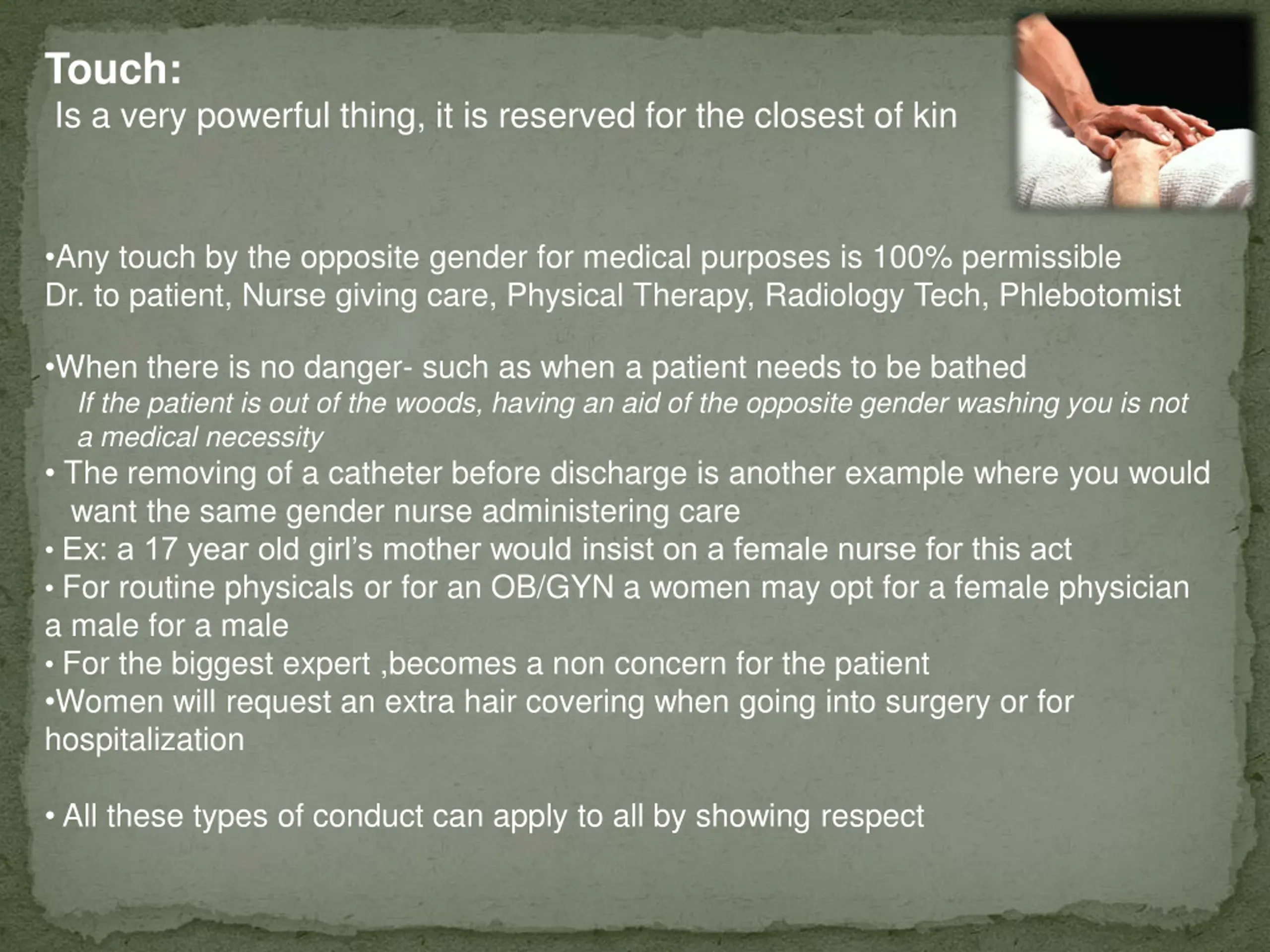 Touch: Is a very powerful thing, it is reserved for the closest of kin Any touch by the opposite gender for medical purposes is 100% permissible Dr. to patient, Nurse giving care, Physical Therapy, Radiology Tech, Phlebotomist When there is no danger- such as when a patient needs to be bathed If the patient is out of the woods, having an aid of the opposite gender washing you is not a medical necessity The removing of a catheter before discharge is another example where you would want the same gender nurse administering care Ex: a 17 year old girl s mother would insist on a female nurse for this act For routine physicals or for an OB/GYN a women may opt for a female physician a male for a male For the biggest expert ,becomes a non concern for the patient Women will request an extra hair covering when going into surgery or for hospitalization All these types of conduct can apply to all by showing respect