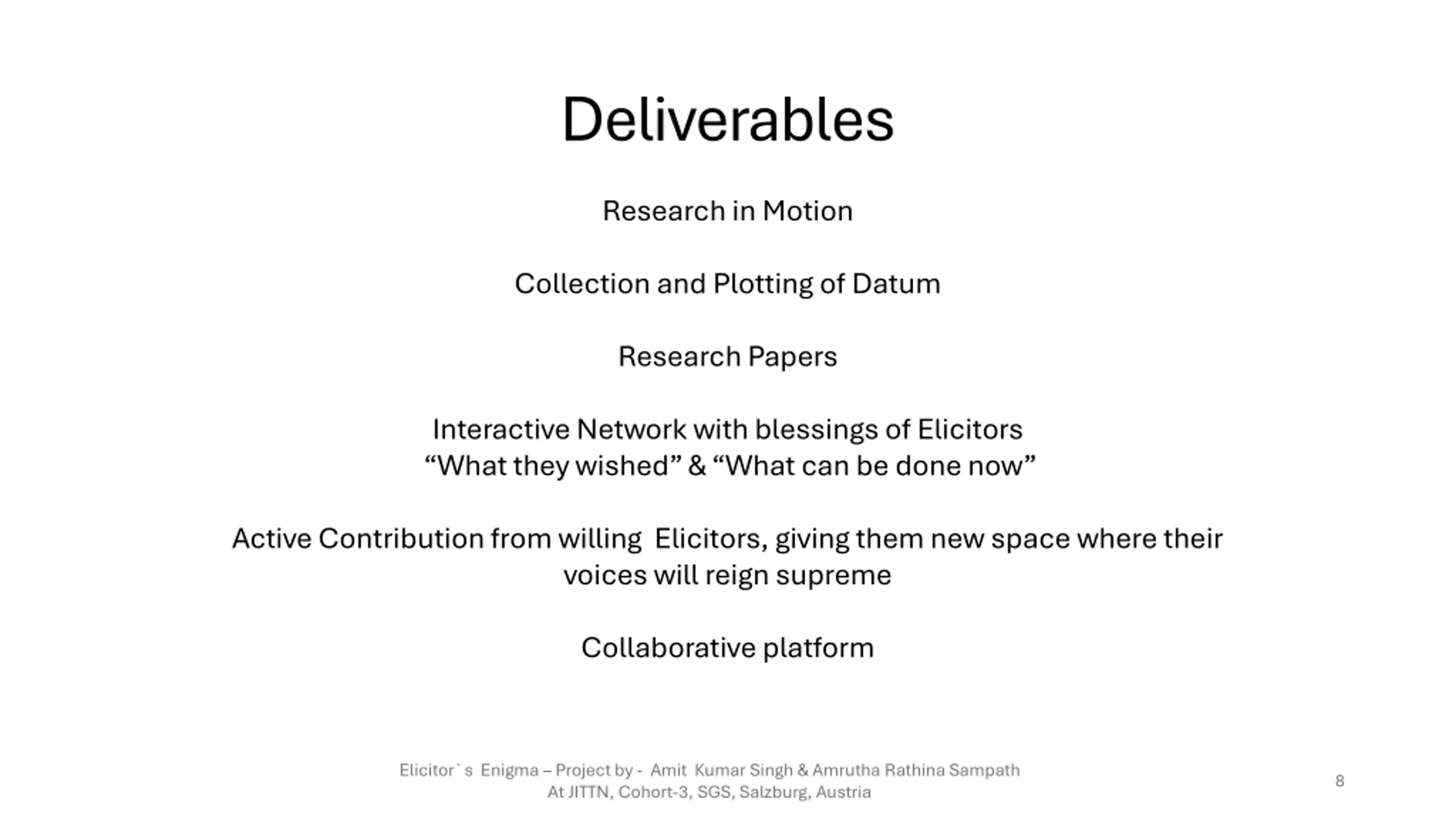 Deliverables Research in Motion Collection and Plotting of Datum Research Papers Interactive Network with blessings of Elicitors What they wished & What can be done now Active Contribution from willing Elicitors, giving them new space where their voices will reign supreme Collaborative platform Elicitor`s Enigma Project by - Amit Kumar Singh & Amrutha Rathina Sampath At JITTN, Cohort-3, SGS, Salzburg, Austria 8