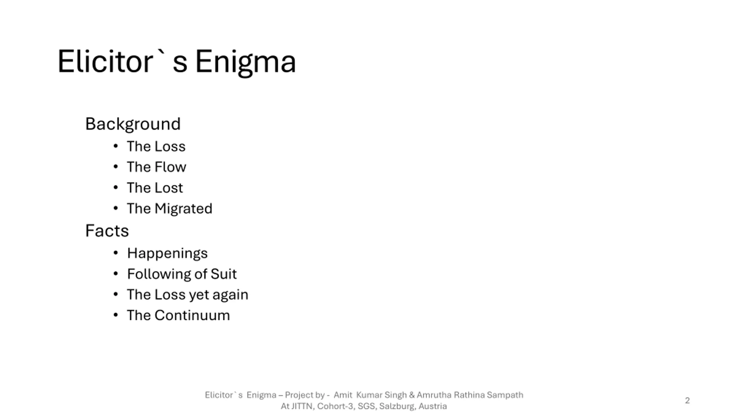 Elicitor`s Enigma Background The Loss The Flow The Lost The Migrated Facts Happenings Following of Suit The Loss yet again The Continuum Elicitor`s Enigma Project by - Amit Kumar Singh & Amrutha Rathina Sampath At JITTN, Cohort-3, SGS, Salzburg, Austria 2