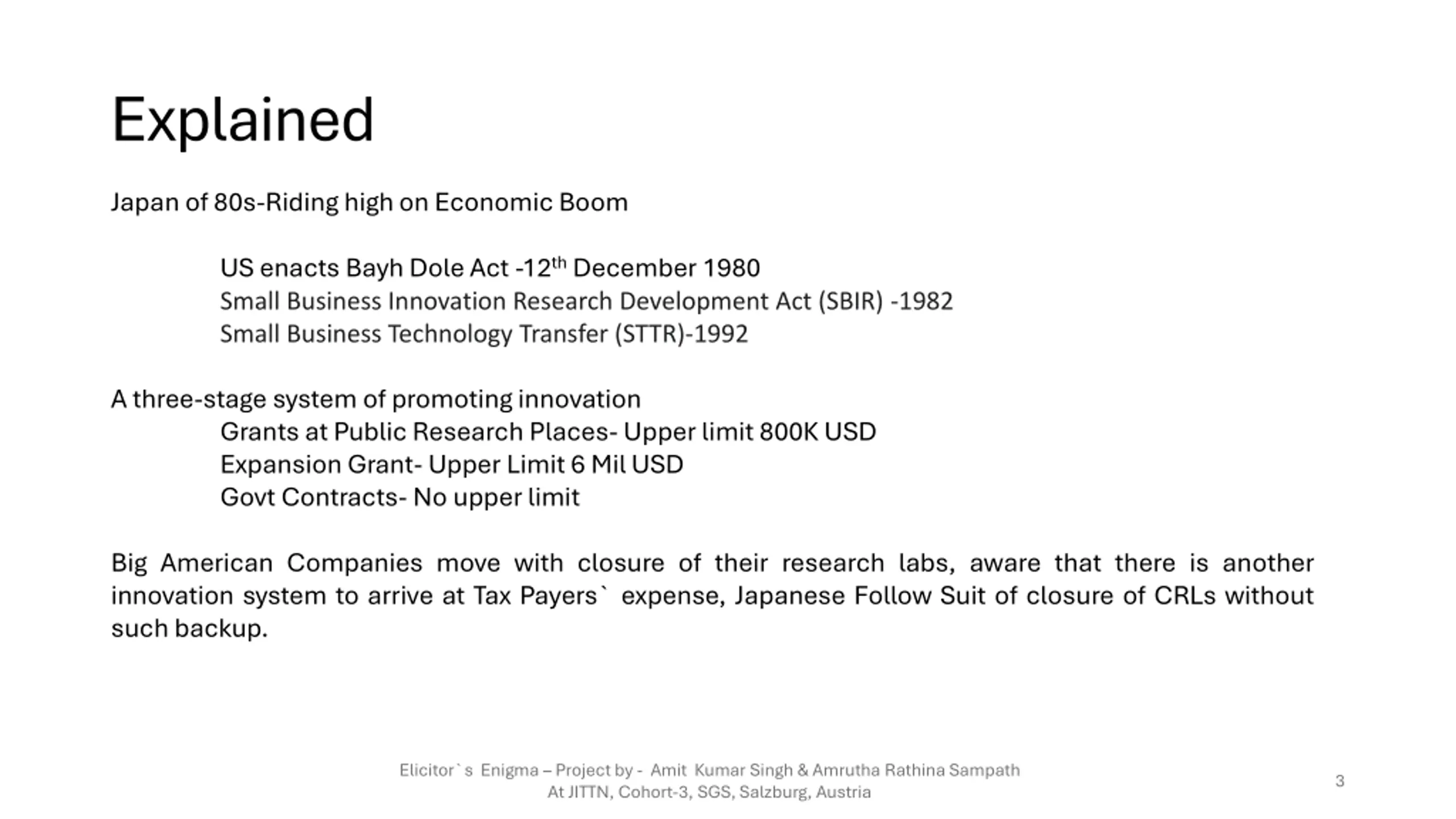 Explained Japan of 80s-Riding high on Economic Boom US enacts Bayh Dole Act -12th December 1980 Small Business Innovation Research Development Act (SBIR) -1982 Small Business Technology Transfer (STTR)-1992 A three-stage system of promoting innovation Grants at Public Research Places- Upper limit 800K USD Expansion Grant- Upper Limit 6 Mil USD Govt Contracts- No upper limit Big American Companies move with closure of their research labs, aware that there is another innovation system to arrive at Tax Payers` expense, Japanese Follow Suit of closure of CRLs without such backup. Elicitor`s Enigma Project by - Amit Kumar Singh & Amrutha Rathina Sampath At JITTN, Cohort-3, SGS, Salzburg, Austria 3