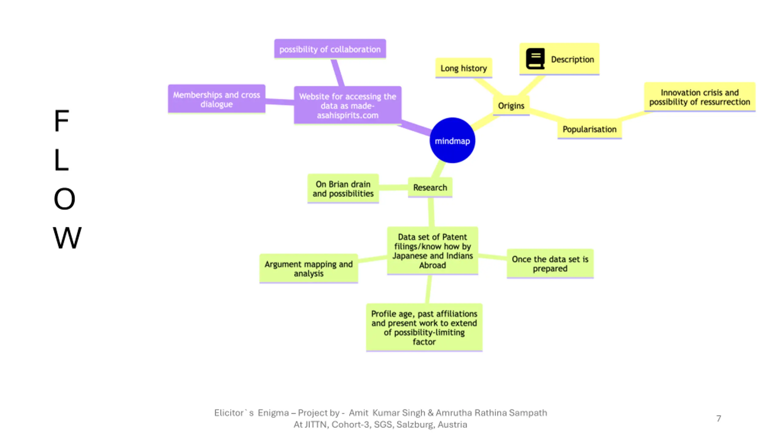 The Processual Flow with the skeleton India Find Indian`s Work Patent Non-patent literature Mentionable work Further plotting Extractions of Actionable intelligence Japan Fining Japanese` Work Patent Non-patent literature Mentionable work Further plotting Extractions of Actionable intelligence Elicitor`s Enigma Project by - Amit Kumar Singh & Amrutha Rathina Sampath At JITTN, Cohort-3, SGS, Salzburg, Austria 6