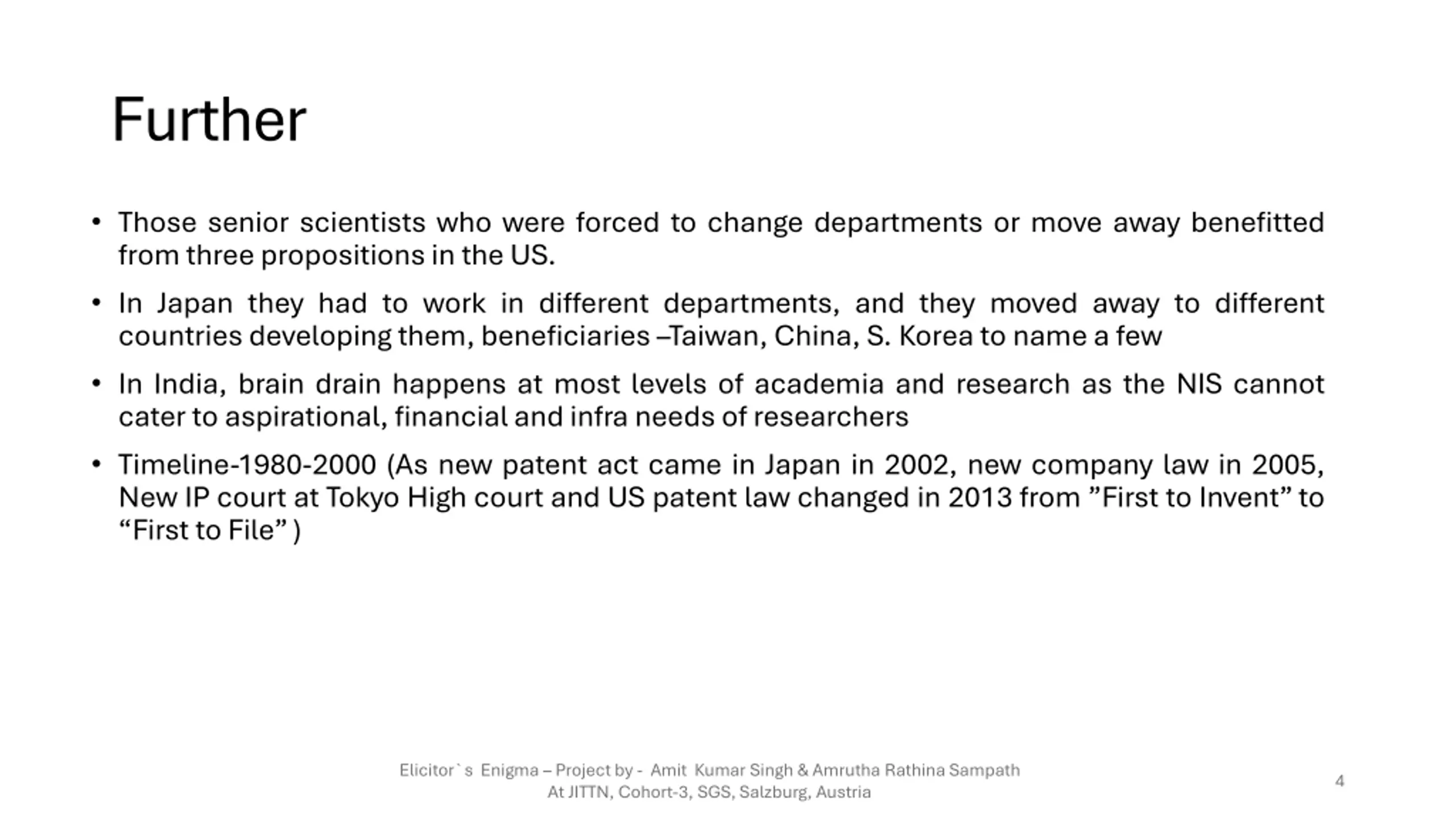 Further Those senior scientists who were forced to change departments or move away benefitted from three propositions in the US. In Japan they had to work in different departments, and they moved away to different countries developing them, beneficiaries Taiwan, China, S. Korea to name a few In India, brain drain happens at most levels of academia and research as the NIS cannot cater to aspirational, financial and infra needs of researchers Timeline-1980-2000 (As new patent act came in Japan in 2002, new company law in 2005, New IP court at Tokyo High court and US patent law changed in 2013 from First to Invent to First to File ) Elicitor`s Enigma Project by - Amit Kumar Singh & Amrutha Rathina Sampath At JITTN, Cohort-3, SGS, Salzburg, Austria 4