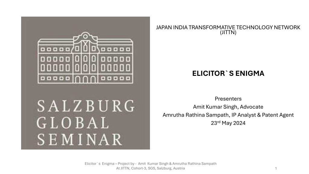 JAPAN INDIA TRANSFORMATIVE TECHNOLOGY NETWORK (JITTN) ELICITOR`S ENIGMA Presenters Amit Kumar Singh, Advocate Amrutha RathinaSampath, IP Analyst & Patent Agent 23rdMay 2024 Elicitor`s Enigma Project by - Amit Kumar Singh & Amrutha Rathina Sampath At JITTN, Cohort-3, SGS, Salzburg, Austria 1