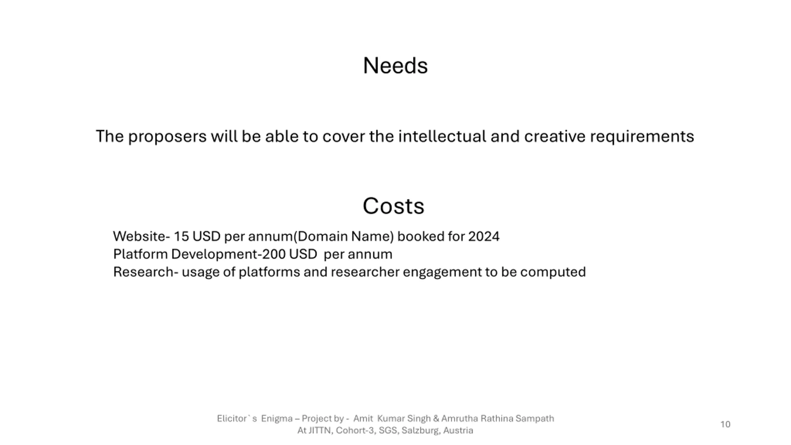 Needs The proposers will be able to cover the intellectual and creative requirements Costs Website- 15 USD per annum(Domain Name) booked for 2024 Platform Development-200 USD per annum Research- usage of platforms and researcher engagement to be computed Elicitor`s Enigma Project by - Amit Kumar Singh & Amrutha Rathina Sampath At JITTN, Cohort-3, SGS, Salzburg, Austria 10