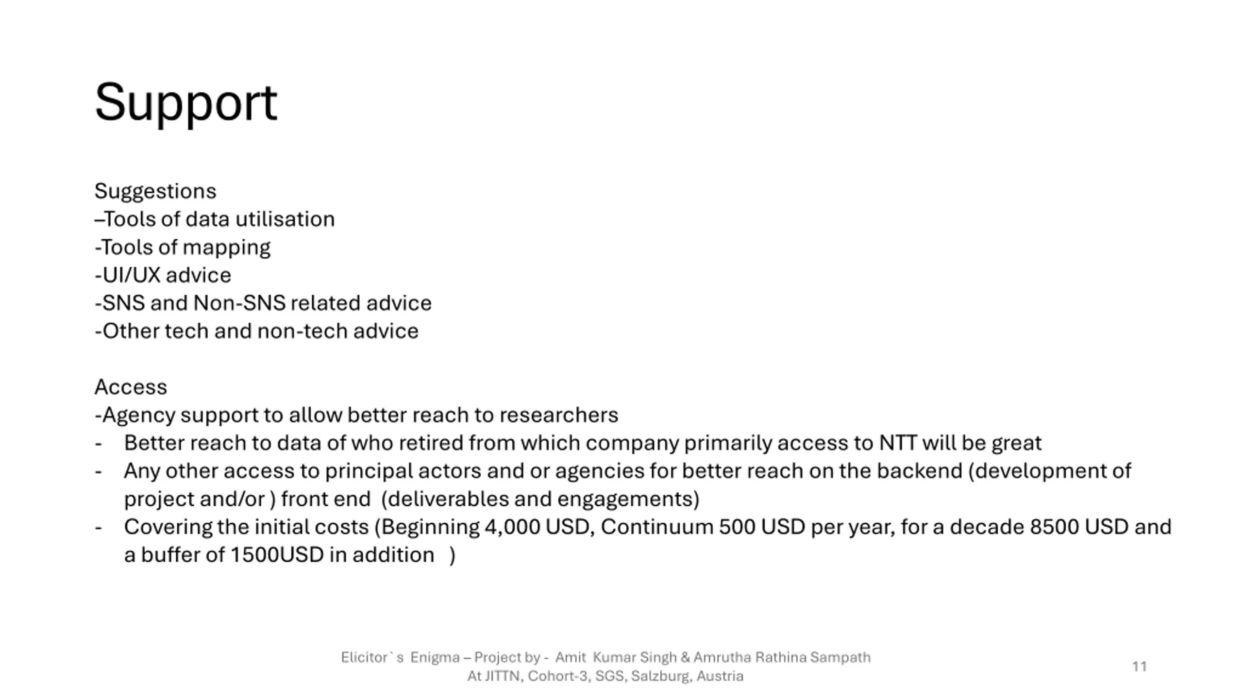 Support Suggestions Tools of data utilisation -Tools of mapping -UI/UX advice -SNS and Non-SNS related advice -Other tech and non-tech advice Access -Agency support to allow better reach to researchers - Better reach to data of who retired from which company primarily access to NTT will be great - Any other access to principal actors and or agencies for better reach on the backend (development of project and/or ) front end (deliverables and engagements) - Covering the initial costs (Beginning 4,000 USD, Continuum 500 USD per year, for a decade 8500 USD and a buffer of 1500USD in addition ) Elicitor`s Enigma Project by - Amit Kumar Singh & Amrutha Rathina Sampath At JITTN, Cohort-3, SGS, Salzburg, Austria 11