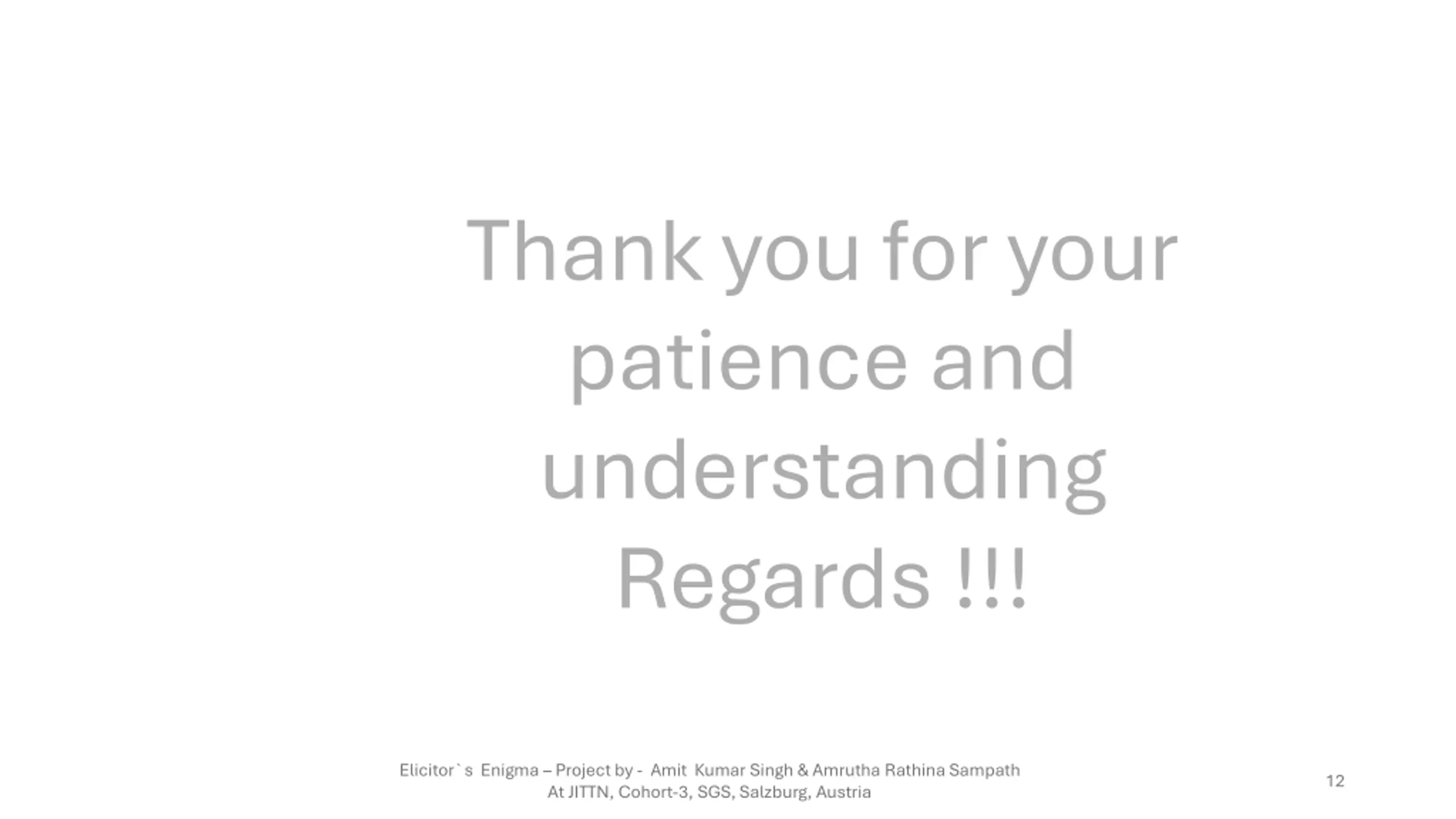 Thank you for your patience and understanding Regards !!! Elicitor`s Enigma Project by - Amit Kumar Singh & Amrutha Rathina Sampath At JITTN, Cohort-3, SGS, Salzburg, Austria 12