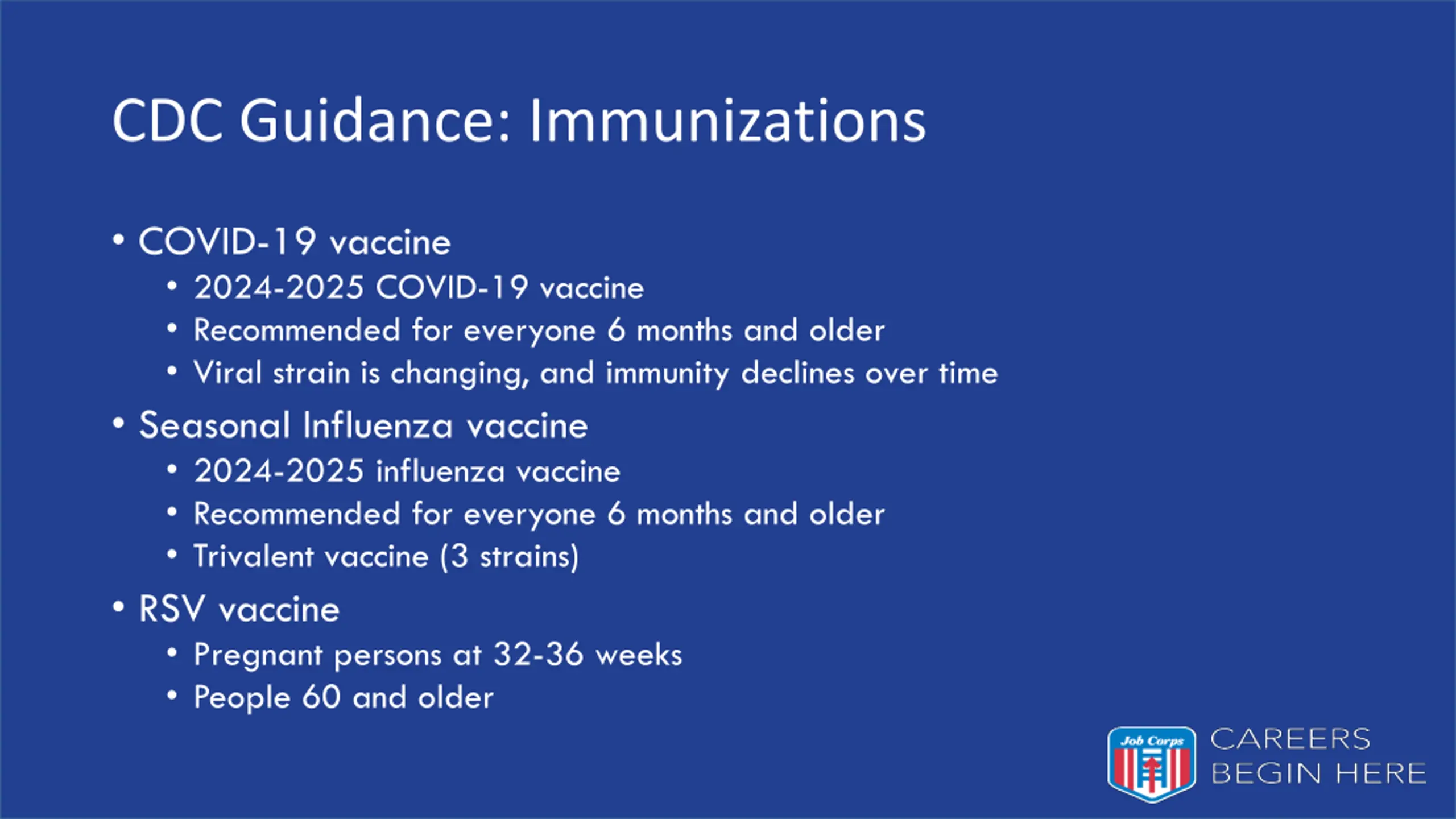 CDC Guidance: Immunizations COVID-19 vaccine 2024-2025 COVID-19 vaccine Recommended for everyone 6 months and older Viral strain is changing, and immunity declines over time Seasonal Influenza vaccine 2024-2025 influenza vaccine Recommended for everyone 6 months and older Trivalent vaccine (3 strains) RSV vaccine Pregnant persons at 32-36 weeks People 60 and older