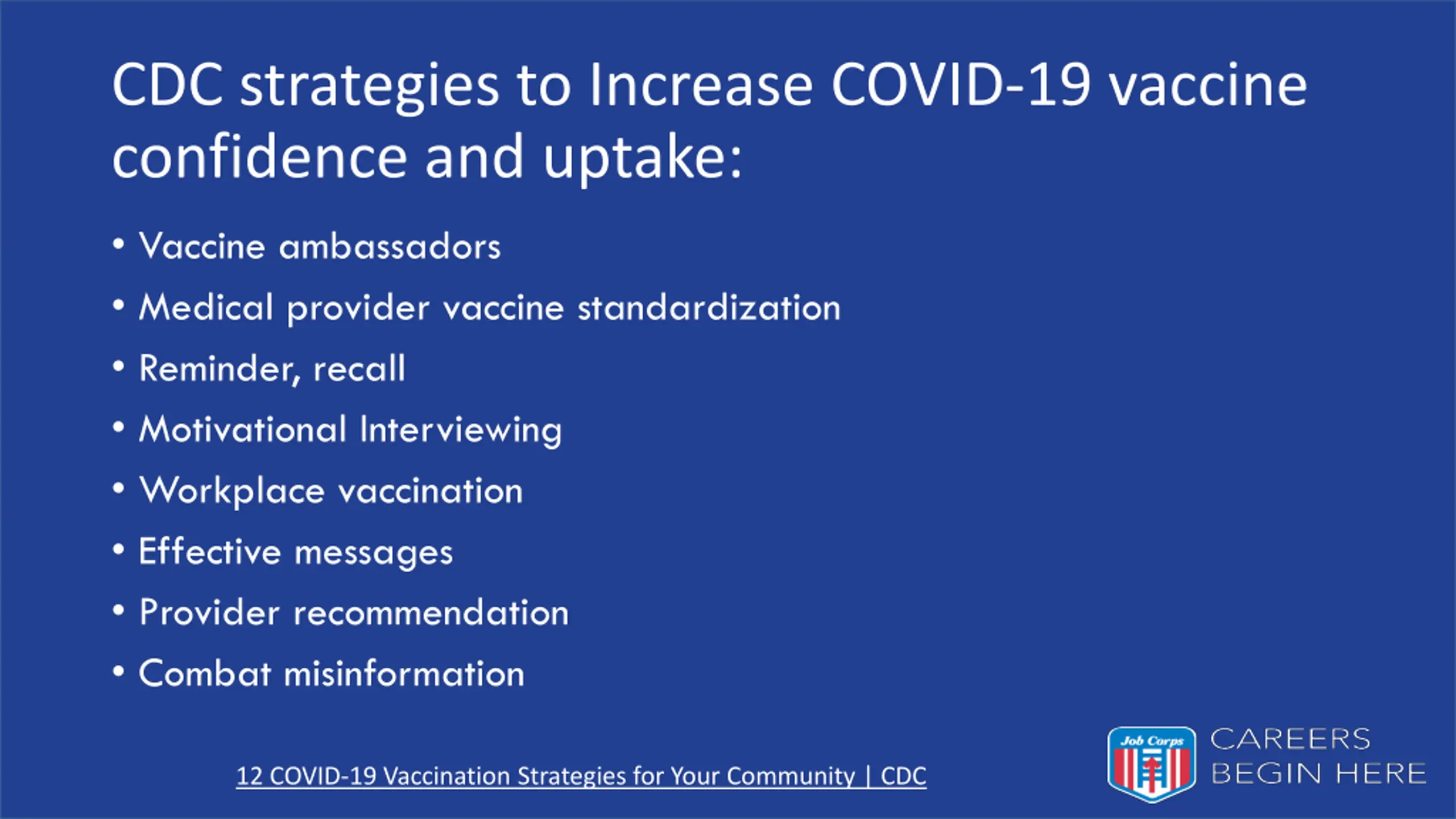 CDC strategies to Increase COVID-19 vaccine confidence and uptake: Vaccine ambassadors Medical provider vaccine standardization Reminder, recall Motivational Interviewing Workplace vaccination Effective messages Provider recommendation Combat misinformation 12 COVID-19 Vaccination Strategies for Your Community | CDC