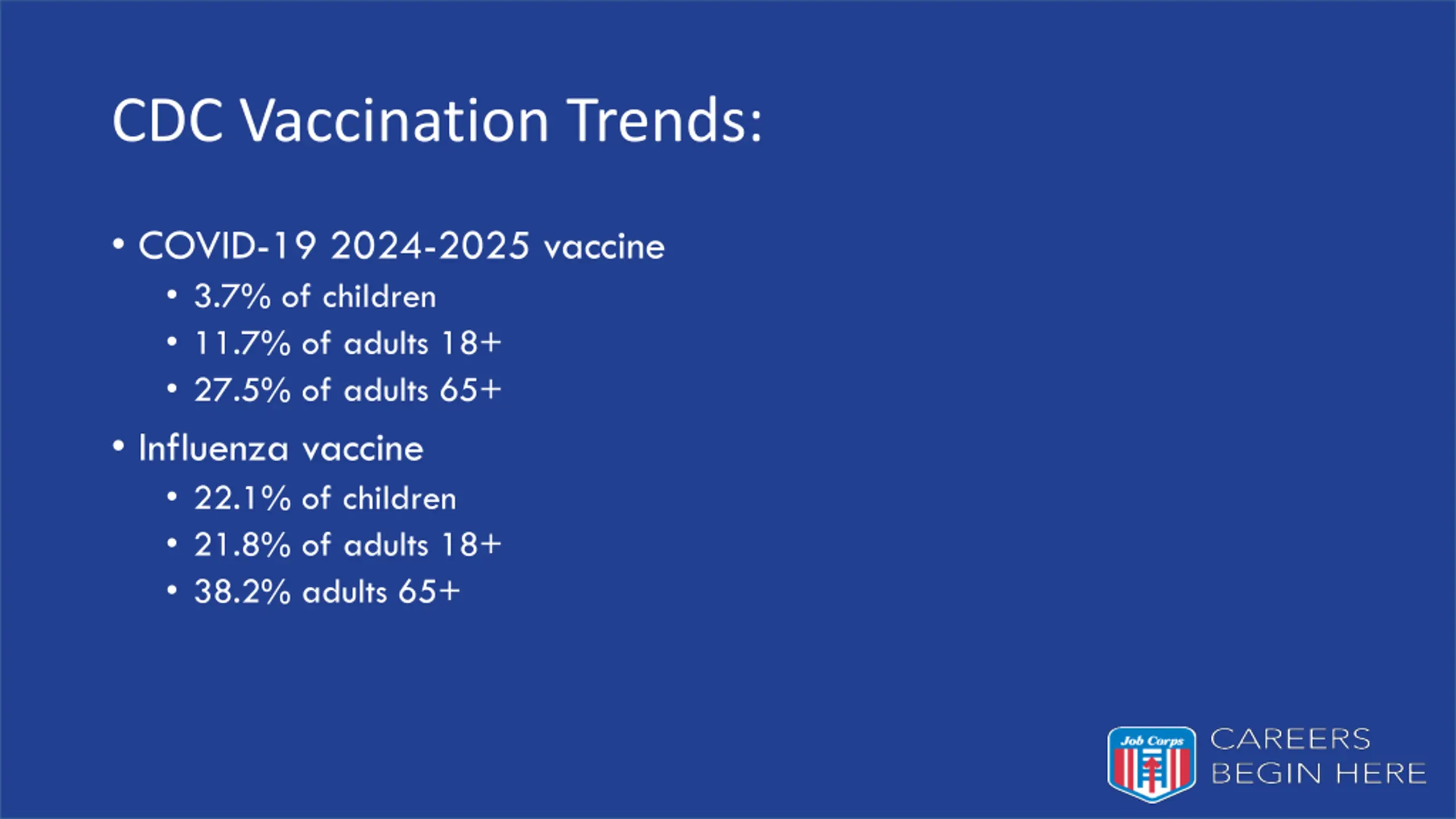 CDC Vaccination Trends: COVID-19 2024-2025 vaccine 3.7% of children 11.7% of adults 18+ 27.5% of adults 65+ Influenza vaccine 22.1% of children 21.8% of adults 18+ 38.2% adults 65+