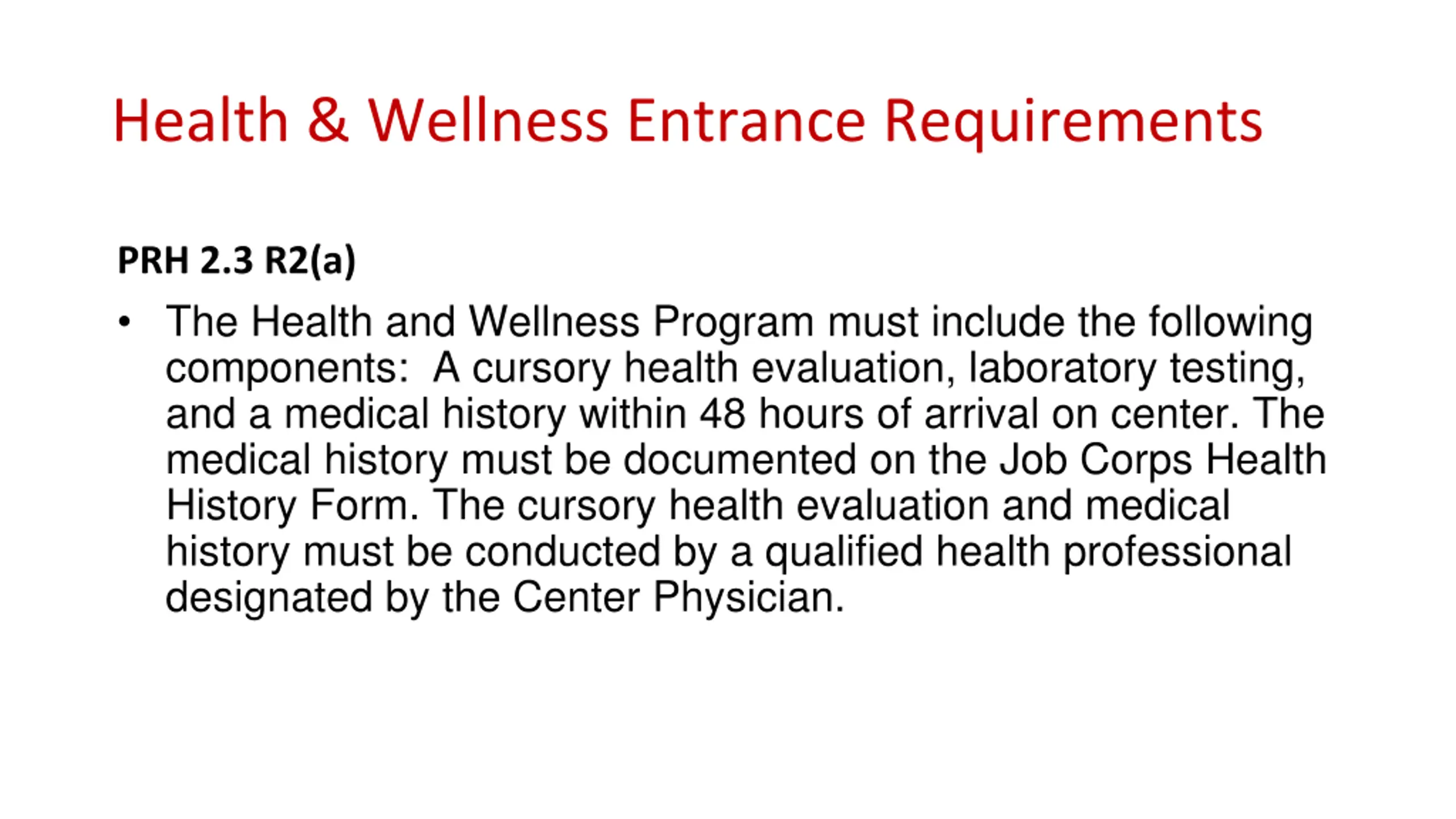 Health & Wellness Entrance Requirements PRH 2.3 R2(a) The Health and Wellness Program must include the following components: A cursory health evaluation, laboratory testing, and a medical history within 48 hours of arrival on center. The medical history must be documented on the Job Corps Health History Form. The cursory health evaluation and medical history must be conducted by a qualified health professional designated by the Center Physician.