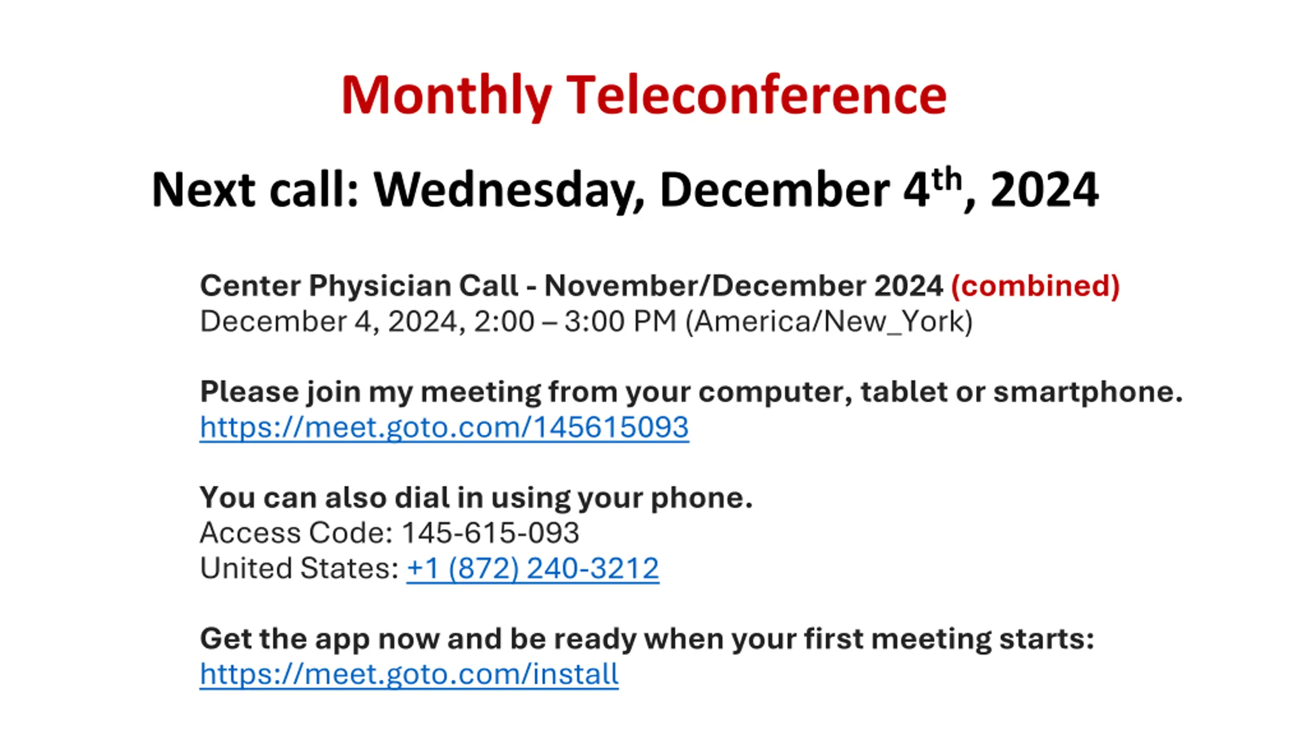 Monthly Teleconference Next call: Wednesday, December 4th, 2024 Center PhysicianCall - November/December 2024 (combined) December 4, 2024, 2:00 3:00 PM (America/New_York) Please join my meeting from your computer, tablet or smartphone. https://meet.goto.com/145615093 You can also dial in using your phone. Access Code: 145-615-093 United States: +1 (872) 240-3212 Get the app now and be ready when your first meeting starts: https://meet.goto.com/install