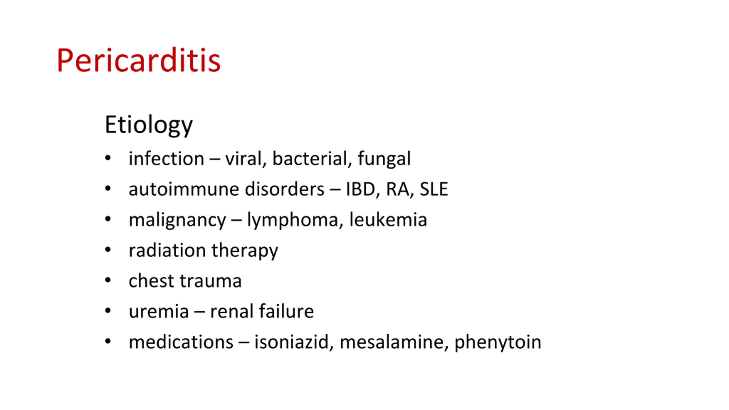 Pericarditis Etiology infection viral, bacterial, fungal autoimmune disorders IBD, RA, SLE malignancy lymphoma, leukemia radiation therapy chest trauma uremia renal failure medications isoniazid, mesalamine, phenytoin