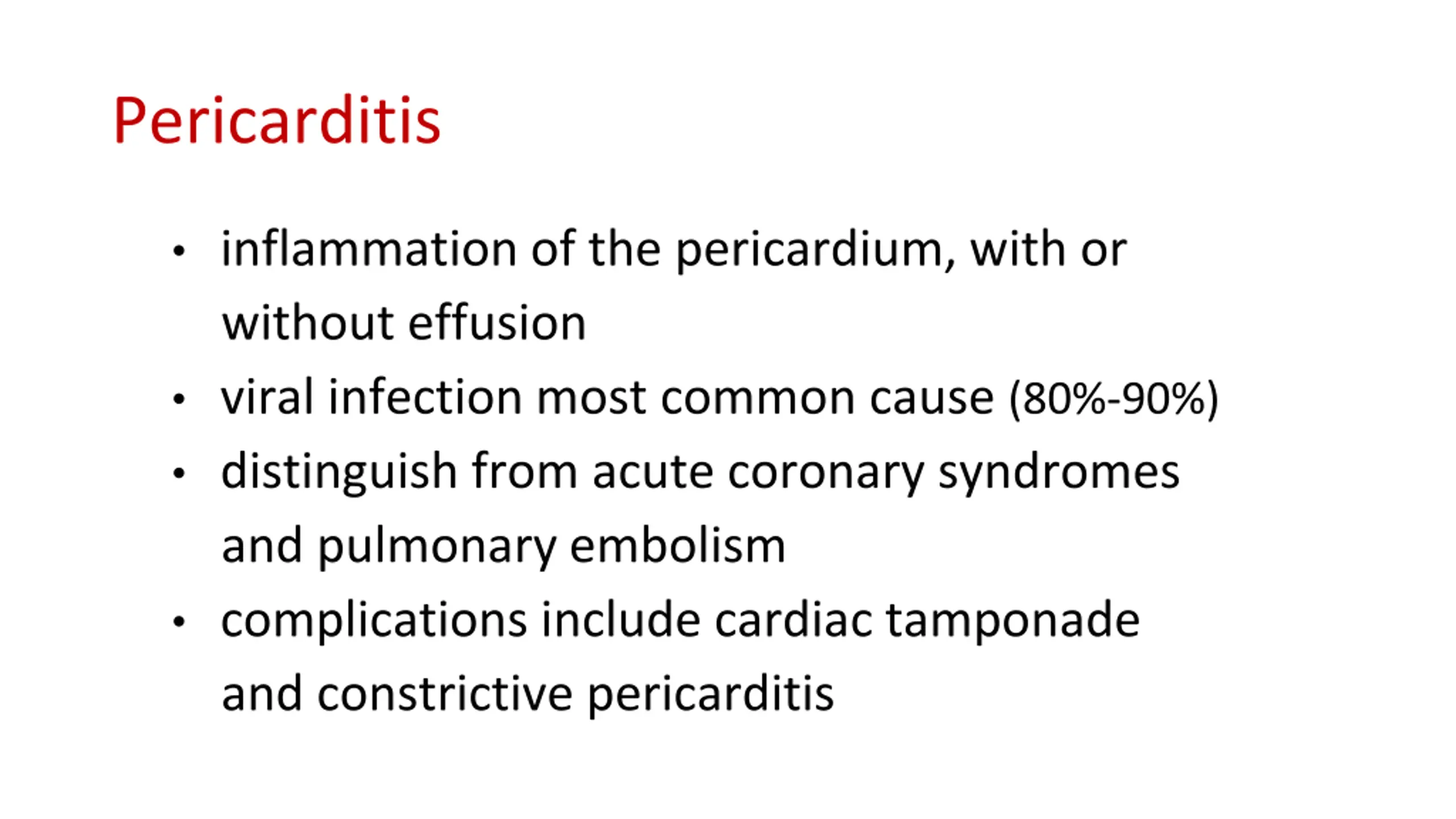 Pericarditis inflammation of the pericardium, with or without effusion viral infection most common cause (80%-90%) distinguish from acute coronary syndromes and pulmonary embolism complications include cardiac tamponade and constrictive pericarditis