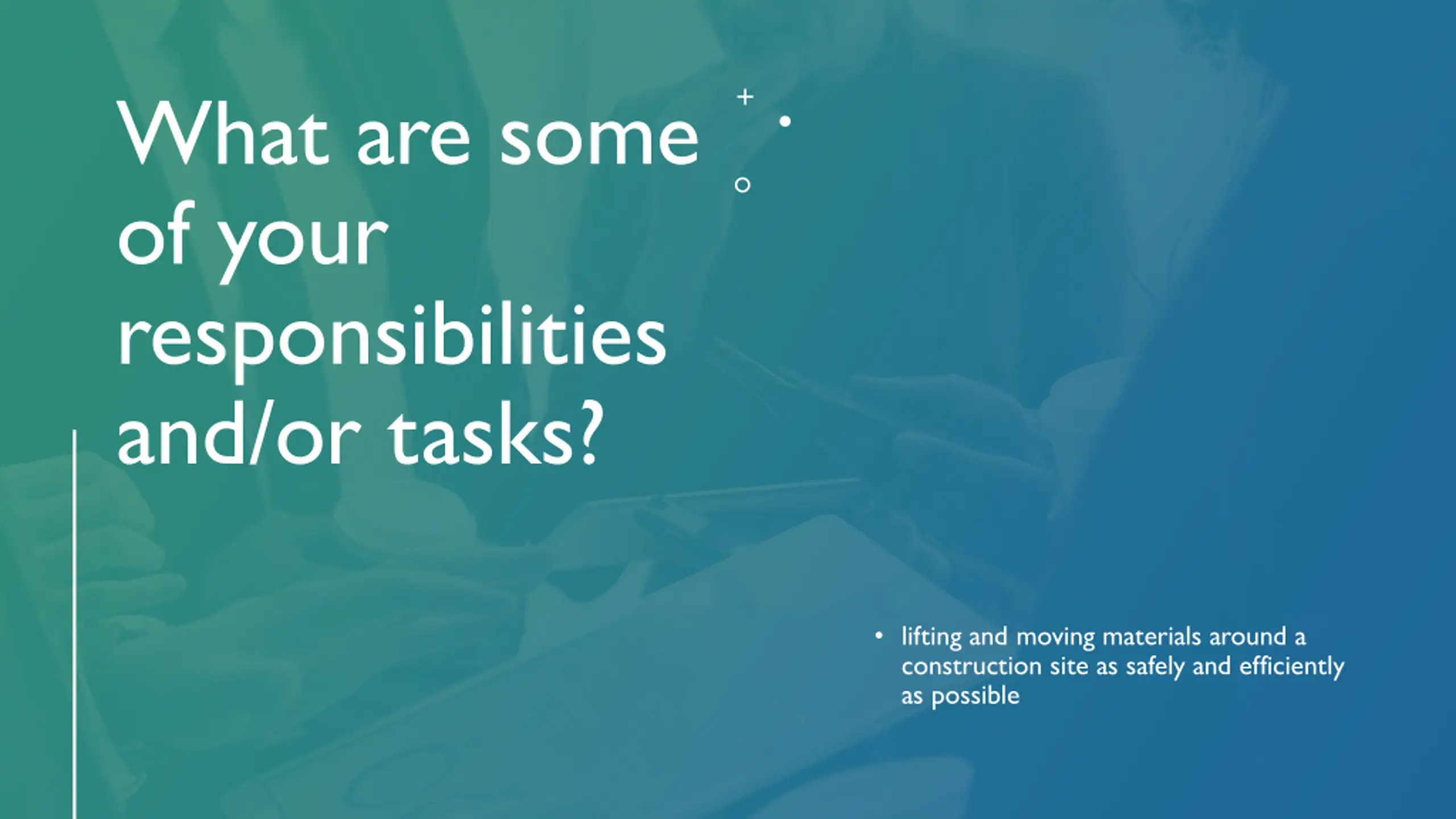 What are some of your responsibilities and/or tasks? lifting and moving materials around a construction site as safely and efficiently as possible