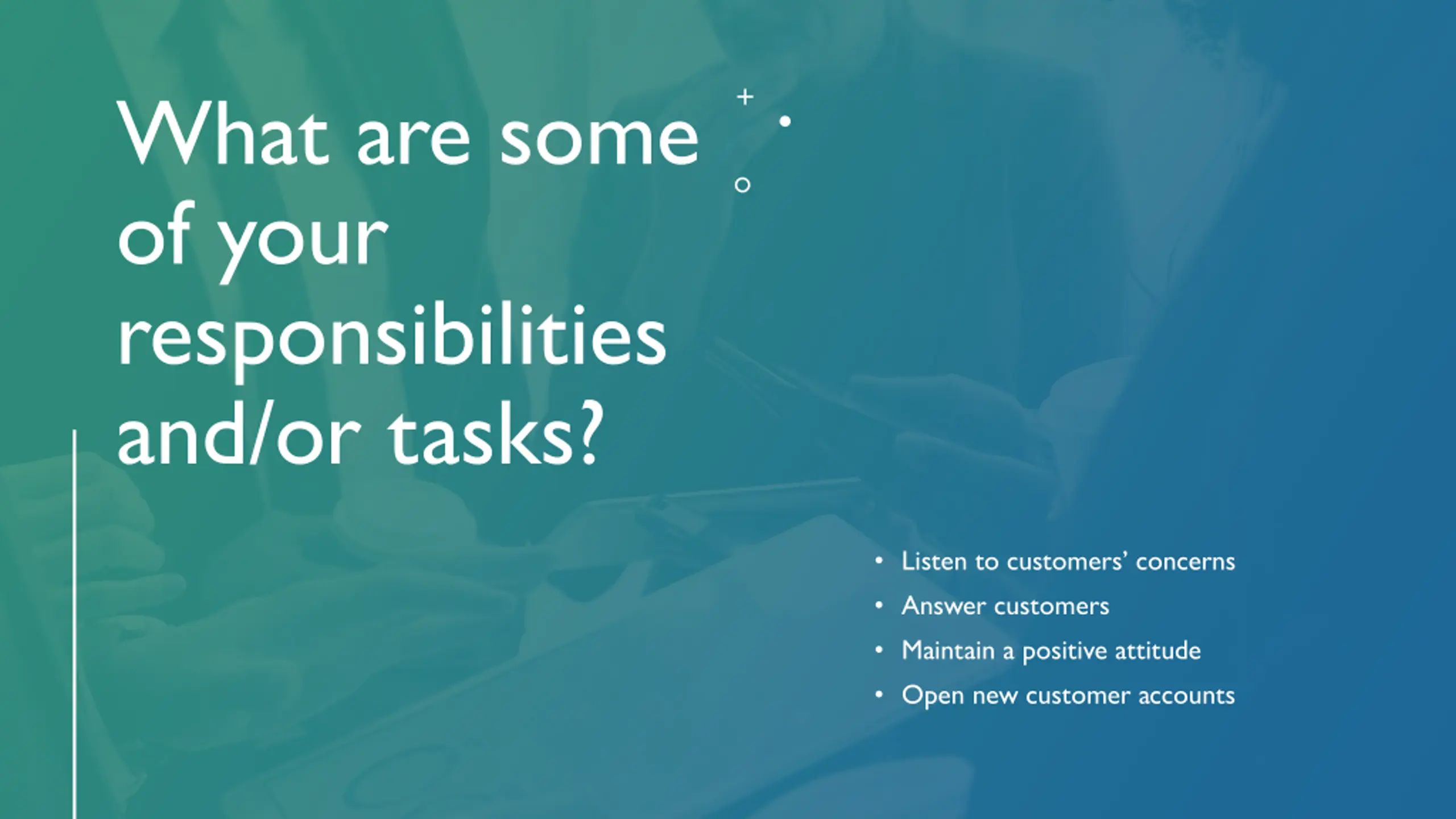 What are some of your responsibilities and/or tasks? Listen to customers concerns Answer customers Maintain a positive attitude Open new customer accounts