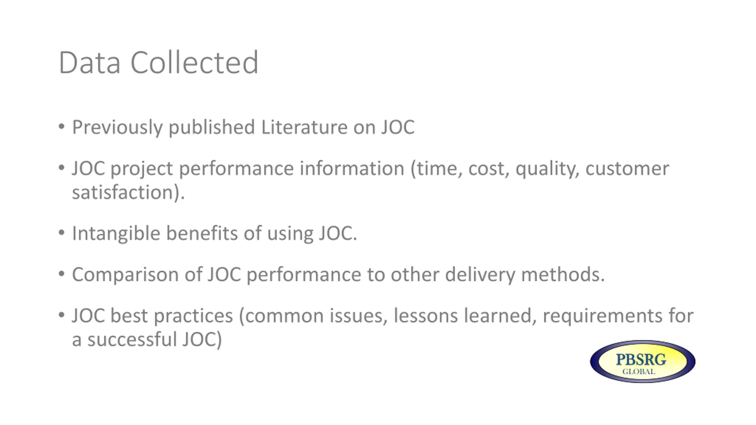 Data Collected Previously published Literature on JOC JOC project performance information (time, cost, quality, customer satisfaction). Intangible benefits of using JOC. Comparison of JOC performance to other delivery methods. JOC best practices (common issues, lessons learned, requirements for a successful JOC) PBSRG PBSRG GLOBAL