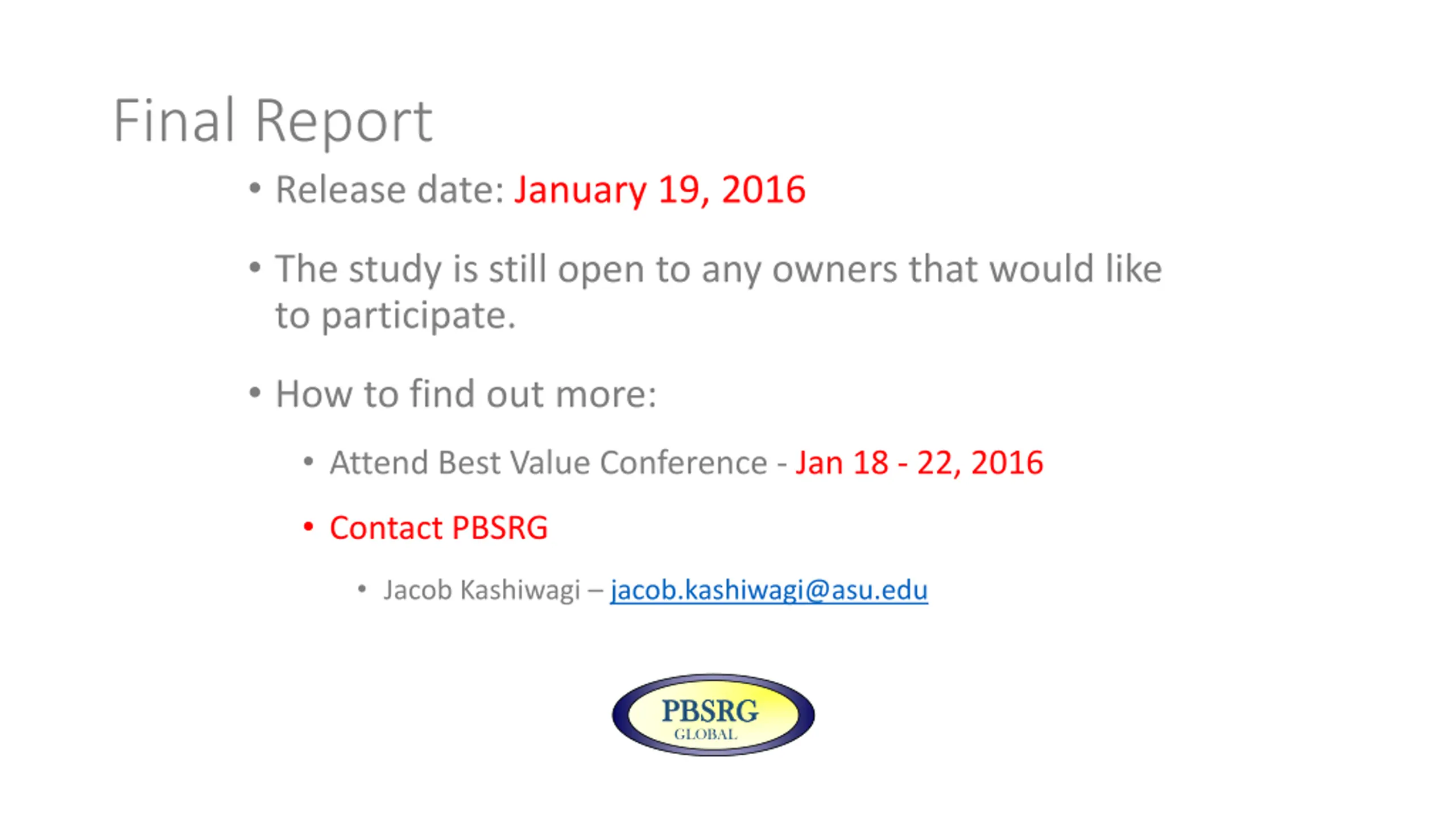 Final Report Release date: January 19, 2016 The study is still open to any owners that would like to participate. How to find out more: Attend Best Value Conference - Jan 18 - 22, 2016 Contact PBSRG Jacob Kashiwagi jacob.kashiwagi@asu.edu PBSRG PBSRG GLOBAL