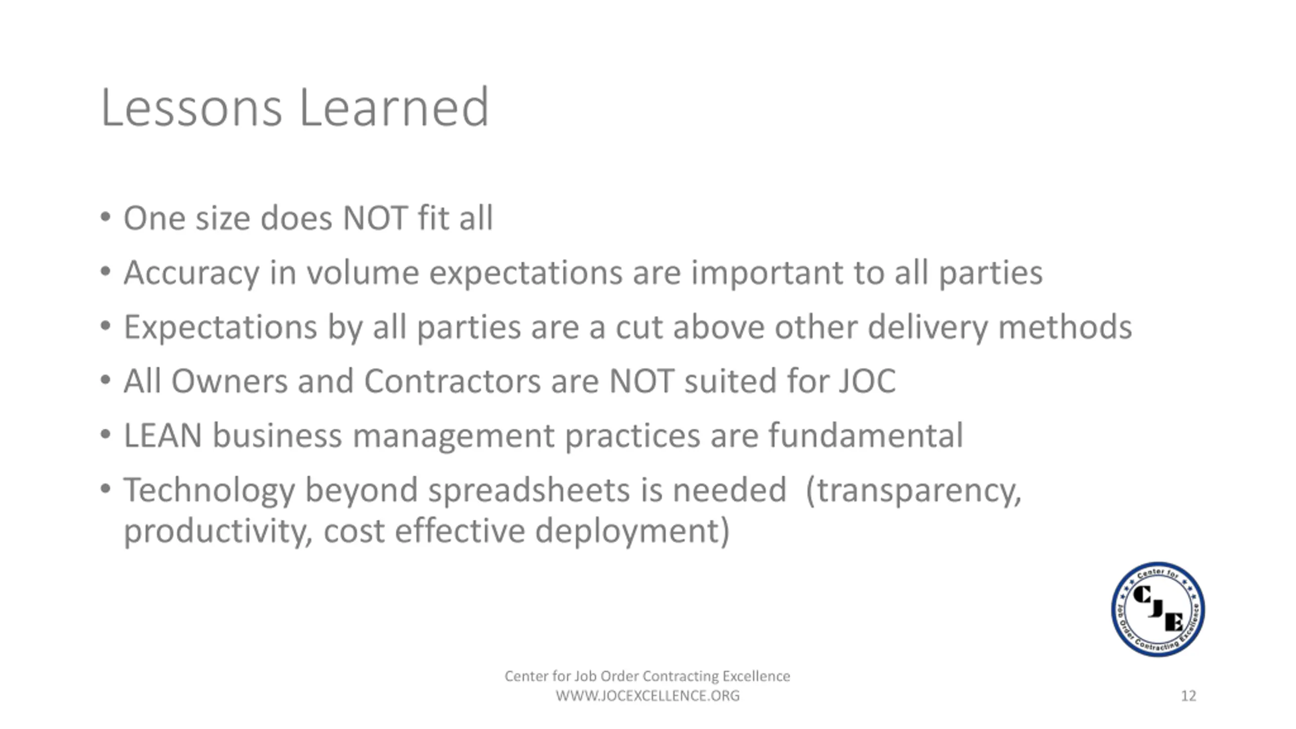 Key Performance Metrics Projects Completed Projects Completed On-Time / On-Budget Change Orders Facility User Satisfaction Responsiveness / Project Delivery Time / Quality / Dollars spent on Construction vs. Procurement Average Project Value Center for Job Order Contracting Excellence WWW.JOCEXCELLENCE.ORG 11