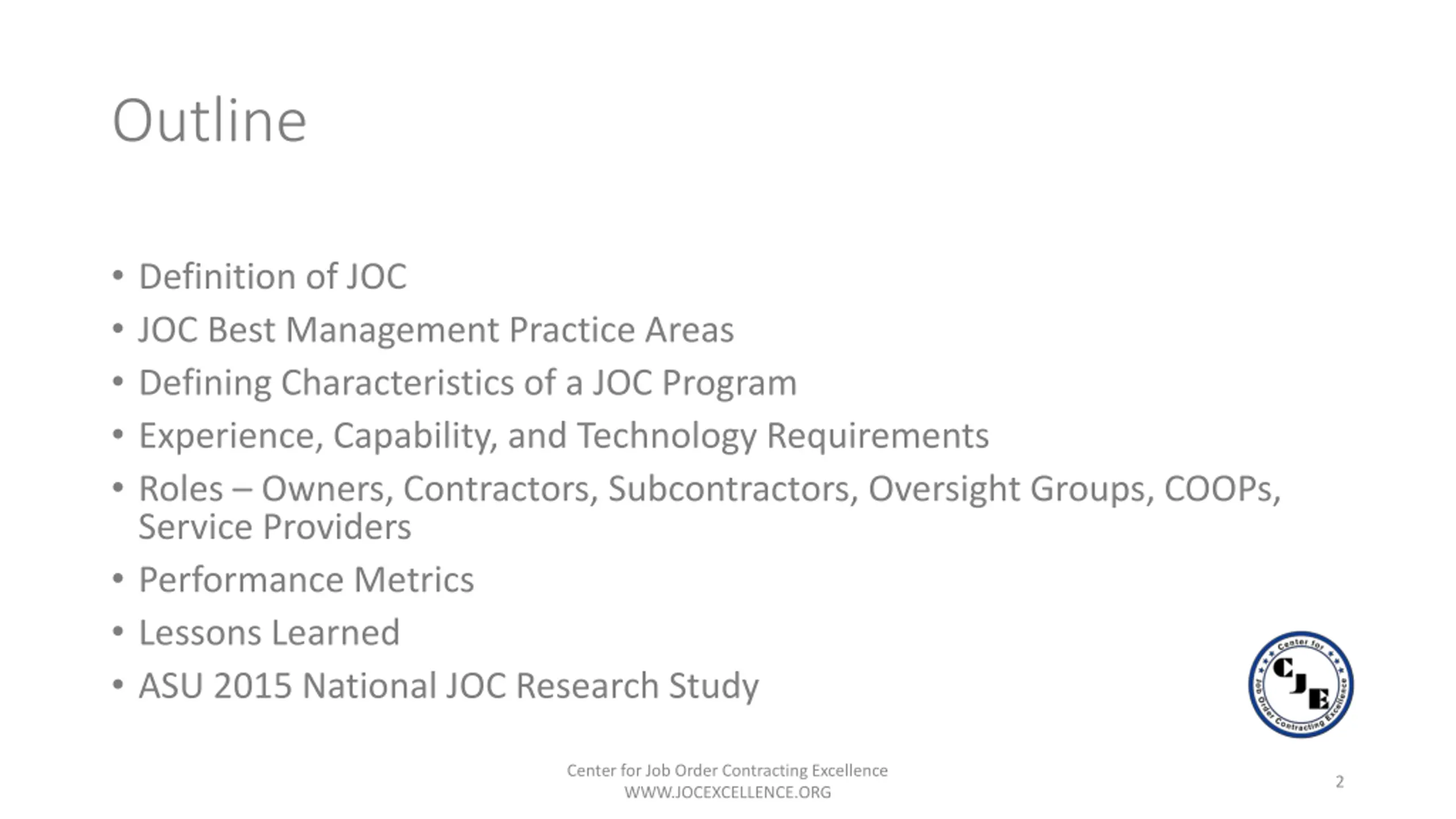 Outline Definition of JOC JOC Best Management Practice Areas Defining Characteristics of a JOC Program Experience, Capability, and Technology Requirements Roles Owners, Contractors, Subcontractors, Oversight Groups, COOPs, Service Providers Performance Metrics Lessons Learned ASU 2015 National JOC Research Study Center for Job Order Contracting Excellence WWW.JOCEXCELLENCE.ORG 2
