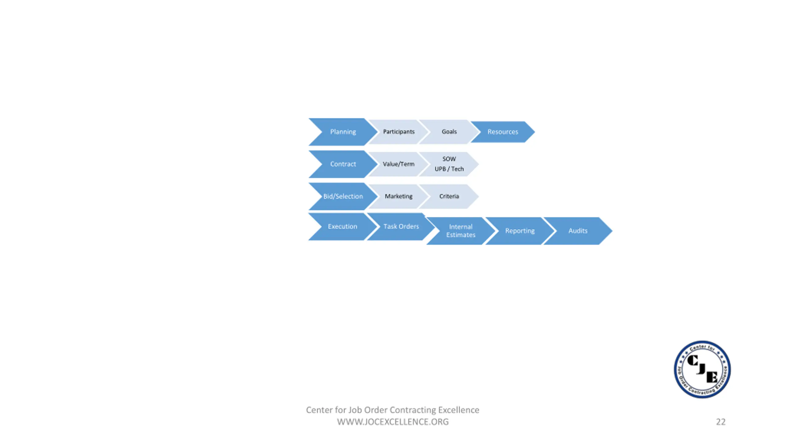 Planning Resources Participants Goals SOW Contract Value/Term UPB / Tech Bid/Selection Marketing Criteria Execution Task Orders Internal Estimates Reporting Audits Center for Job Order Contracting Excellence WWW.JOCEXCELLENCE.ORG 22
