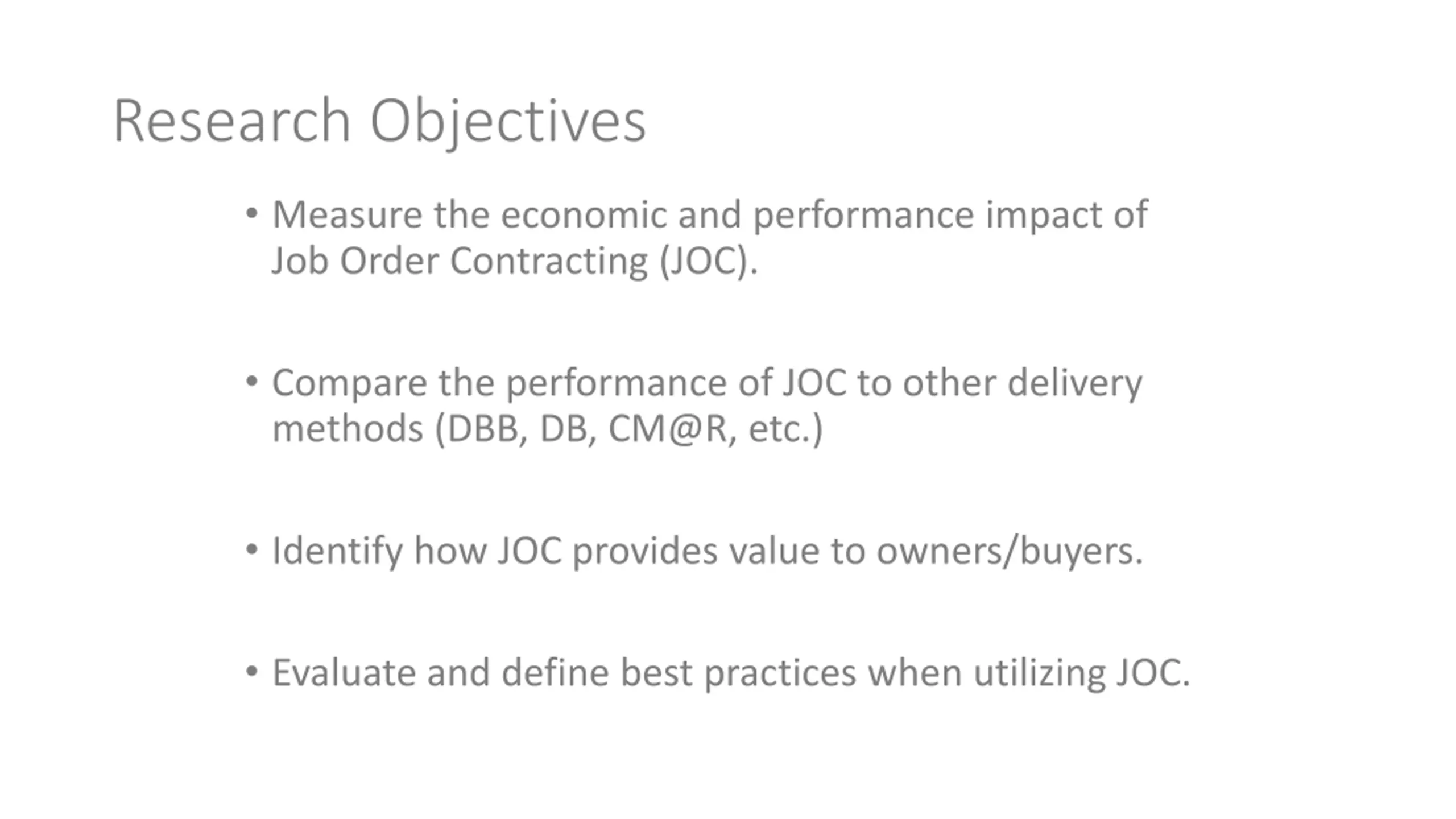 Research Objectives Measure the economic and performance impact of Job Order Contracting (JOC). Compare the performance of JOC to other delivery methods (DBB, DB, CM@R, etc.) Identify how JOC provides value to owners/buyers. Evaluate and define best practices when utilizing JOC.