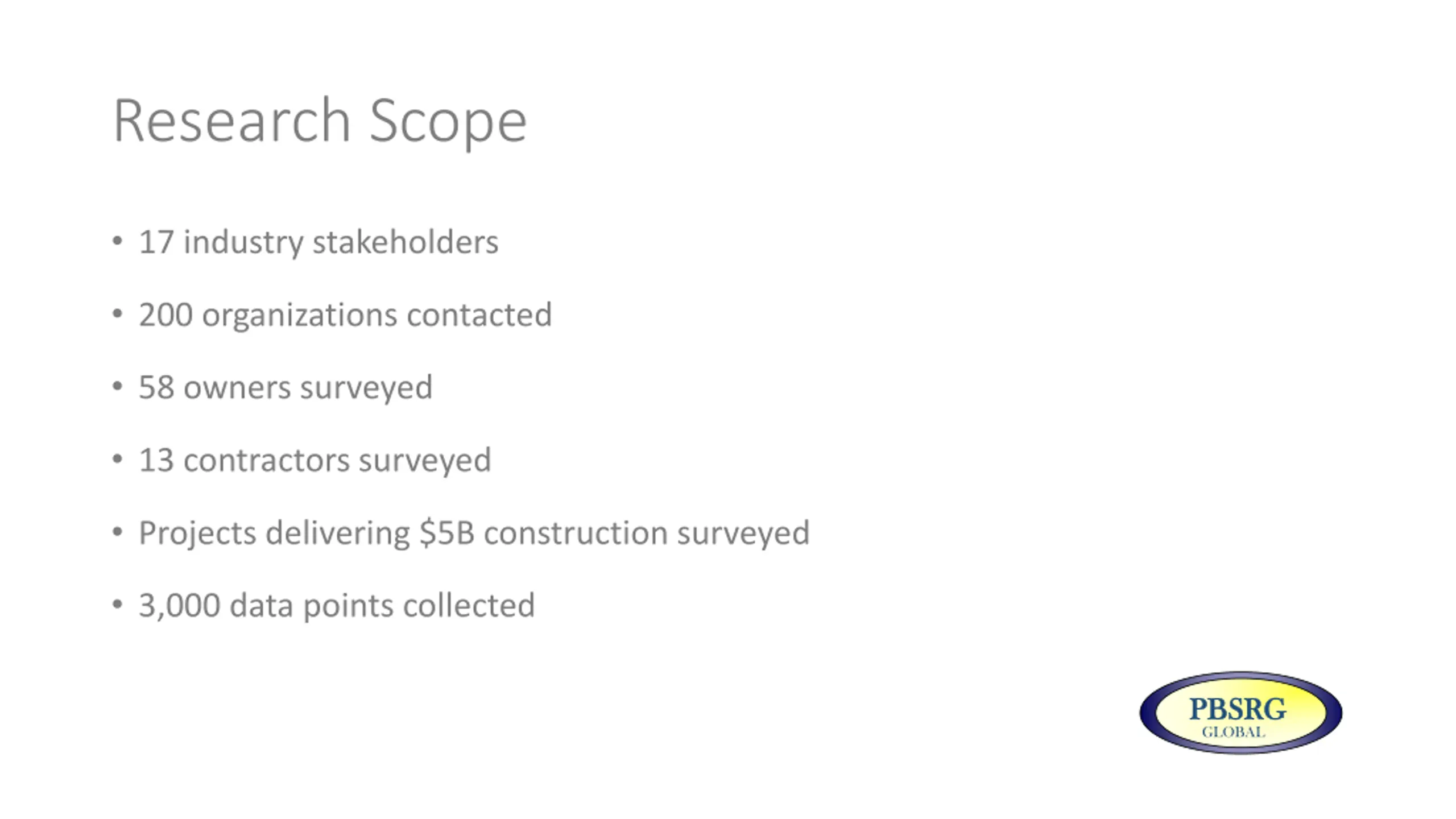 Research Scope 17 industry stakeholders 200 organizations contacted 58 owners surveyed 13 contractors surveyed Projects delivering $5B construction surveyed 3,000 data points collected PBSRG PBSRG GLOBAL