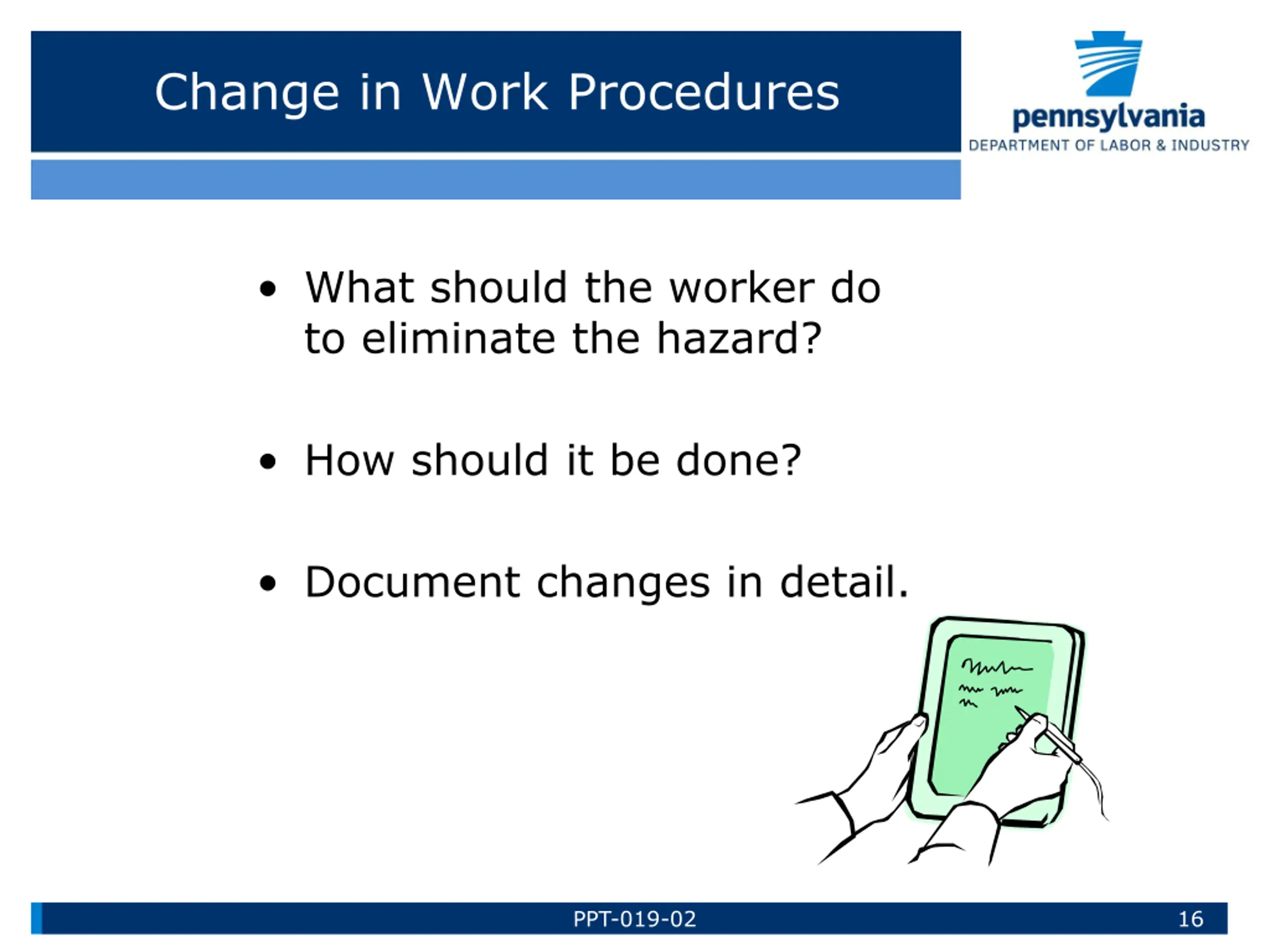 Change in Work Procedures What should the worker do to eliminate the hazard? How should it be done? Document changes in detail. PPT-019-02 16