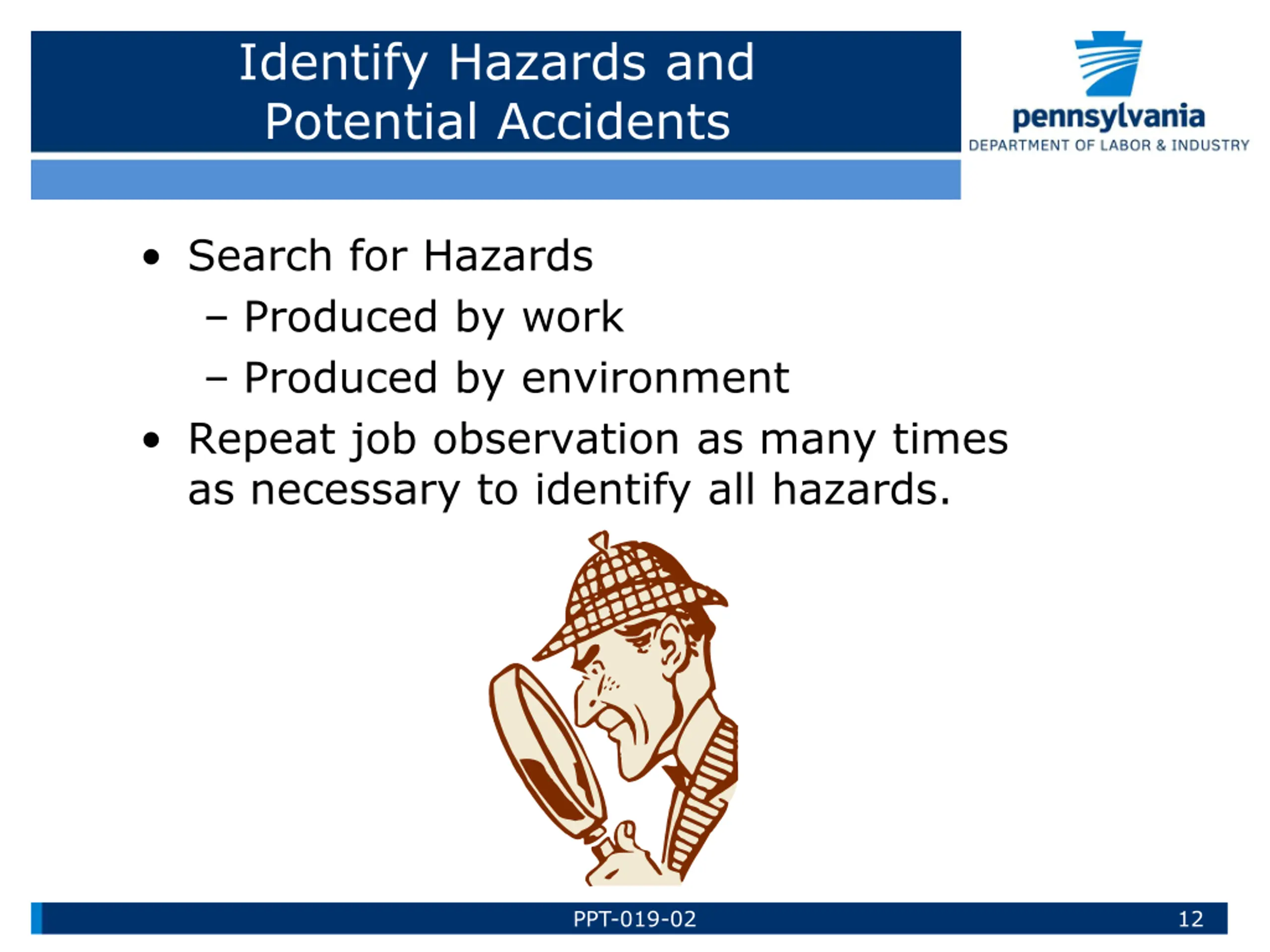 Identify Hazards and Potential Accidents Search for Hazards Produced by work Produced by environment Repeat job observation as many times as necessary to identify all hazards. PPT-019-02 12