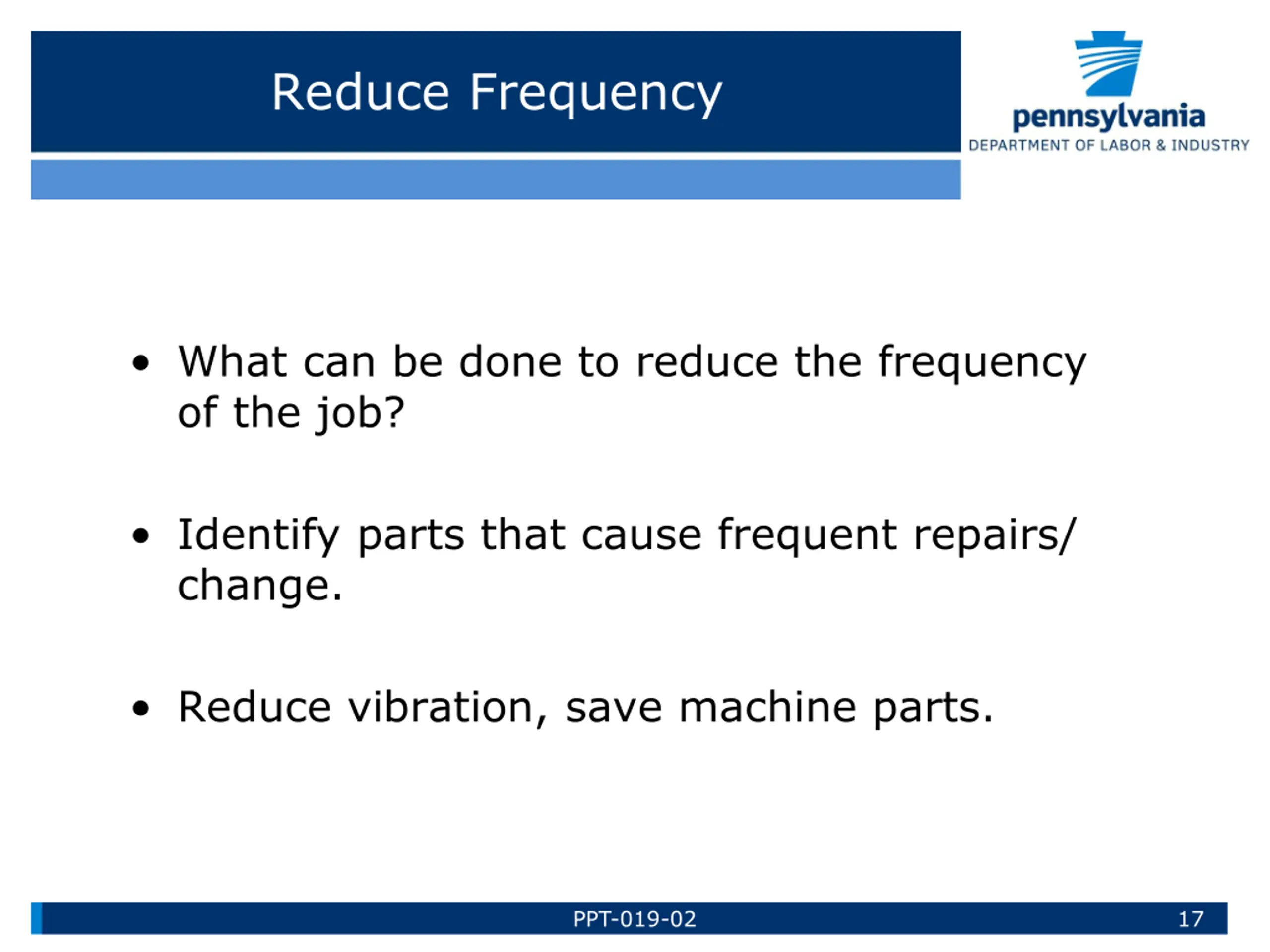 Reduce Frequency What can be done to reduce the frequency of the job? Identify parts that cause frequent repairs/ change. Reduce vibration, save machine parts. PPT-019-02 17