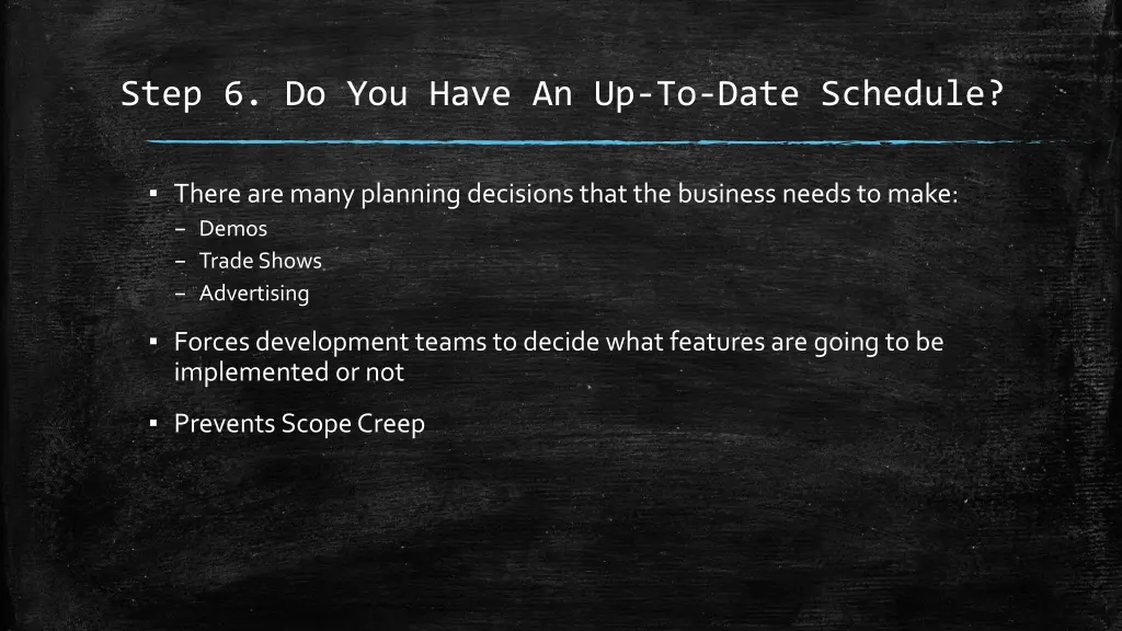 Step 6. Do You Have An Up-To-Date Schedule? There are many planning decisions that the business needs to make: Demos Trade Shows Advertising Forces development teams to decide what features are going to be implemented or not Prevents Scope Creep