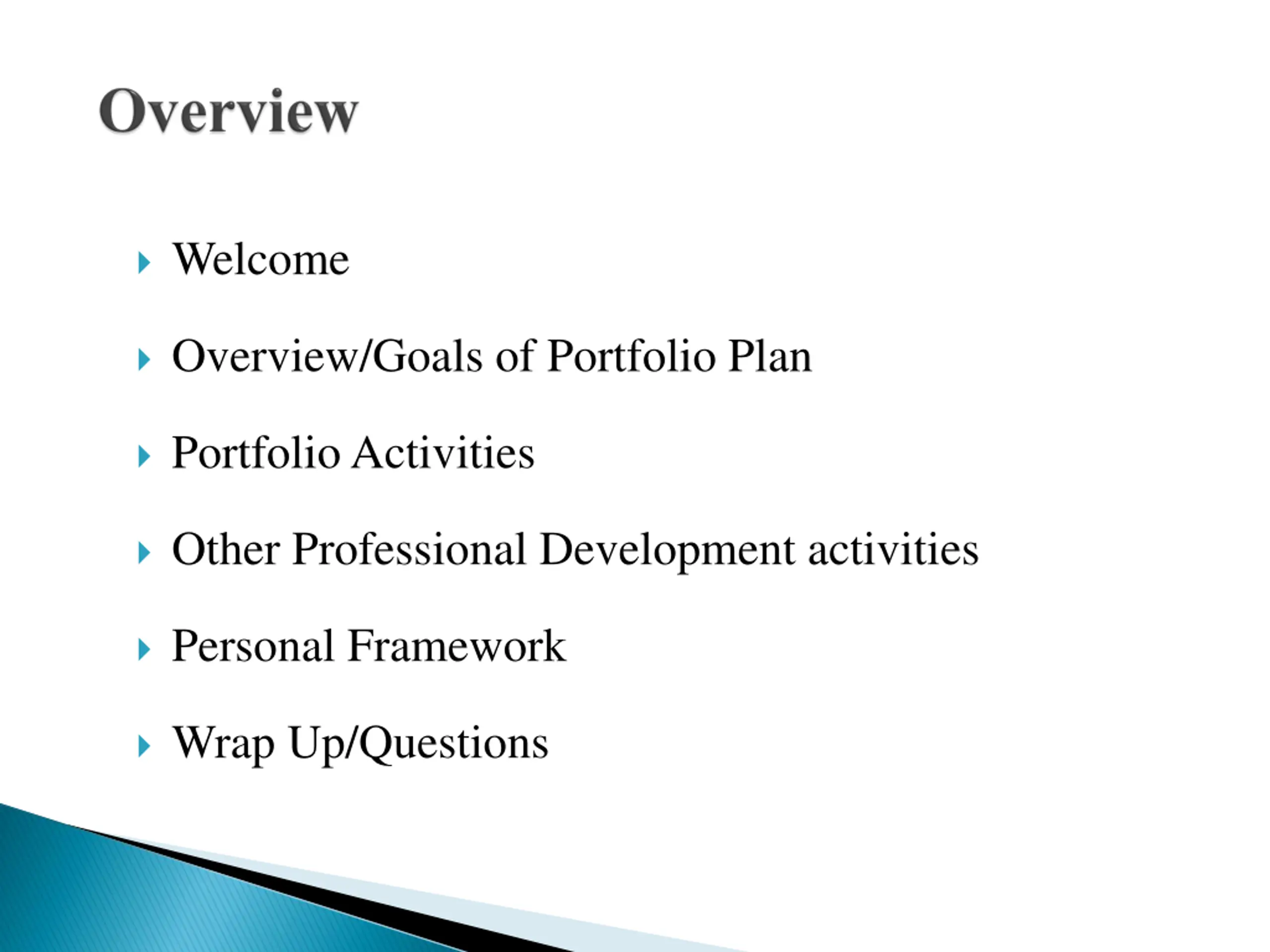 Welcome Overview/Goals of Portfolio Plan Portfolio Activities Other Professional Development activities Personal Framework Wrap Up/Questions