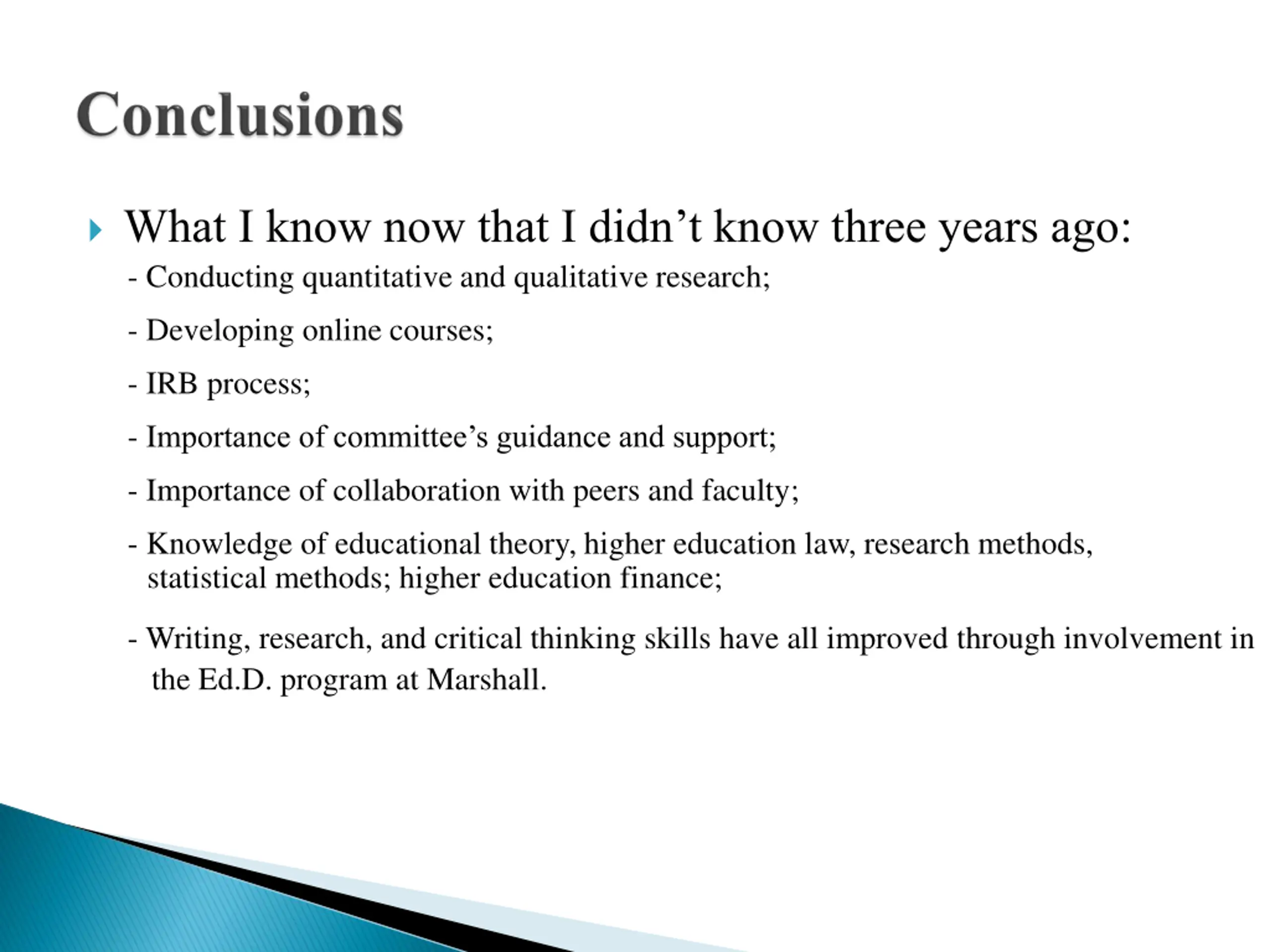 What I know now that I didnt know three years ago: - Conducting quantitative and qualitative research; - Developing online courses; - IRB process; - Importance of committee s guidance and support; - Importance of collaboration with peers and faculty; statistical methods; higher education finance; - Knowledge of educational theory, higher education law, research methods, - Writing, research, and critical thinking skills have all improved through involvement in the Ed.D. program at Marshall.