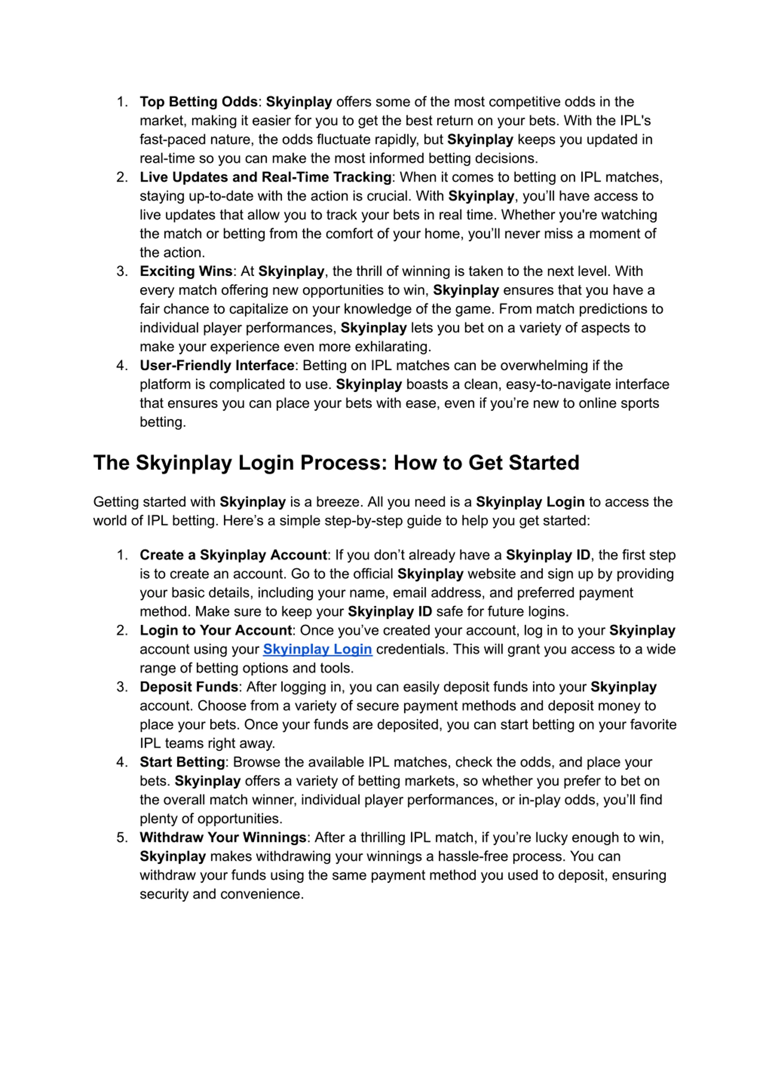1. Top Betting Odds: Skyinplay offers some of the most competitive odds in the market, making it easier for you to get the best return on your bets. With the IPL's fast-paced nature, the odds fluctuate rapidly, but Skyinplay keeps you updated in real-time so you can make the most informed betting decisions. 2. Live Updates and Real-Time Tracking: When it comes to betting on IPL matches, staying up-to-date with the action is crucial. With Skyinplay, you ll have access to live updates that allow you to track your bets in real time. Whether you're watching the match or betting from the comfort of your home, you ll never miss a moment of the action. 3. Exciting Wins: At Skyinplay, the thrill of winning is taken to the next level. With every match offering new opportunities to win, Skyinplay ensures that you have a fair chance to capitalize on your knowledge of the game. From match predictions to individual player performances, Skyinplay lets you bet on a variety of aspects to make your experience even more exhilarating. 4. User-Friendly Interface: Betting on IPL matches can be overwhelming if the platform is complicated to use. Skyinplay boasts a clean, easy-to-navigate interface that ensures you can place your bets with ease, even if you re new to online sports betting. The Skyinplay Login Process: How to Get Started Getting started with Skyinplay is a breeze. All you need is a Skyinplay Login to access the world of IPL betting. Here s a simple step-by-step guide to help you get started: 1. Create a Skyinplay Account: If you don t already have a Skyinplay ID, the first step is to create an account. Go to the official Skyinplay website and sign up by providing your basic details, including your name, email address, and preferred payment method. Make sure to keep your Skyinplay ID safe for future logins. 2. Login to Your Account: Once you ve created your account, log in to your Skyinplay account using your Skyinplay Login credentials. This will grant you access to a wide range of betting options and tools. 3. Deposit Funds: After logging in, you can easily deposit funds into your Skyinplay account. Choose from a variety of secure payment methods and deposit money to place your bets. Once your funds are deposited, you can start betting on your favorite IPL teams right away. 4. Start Betting: Browse the available IPL matches, check the odds, and place your bets. Skyinplay offers a variety of betting markets, so whether you prefer to bet on the overall match winner, individual player performances, or in-play odds, you ll find plenty of opportunities. 5. Withdraw Your Winnings: After a thrilling IPL match, if you re lucky enough to win, Skyinplay makes withdrawing your winnings a hassle-free process. You can withdraw your funds using the same payment method you used to deposit, ensuring security and convenience.