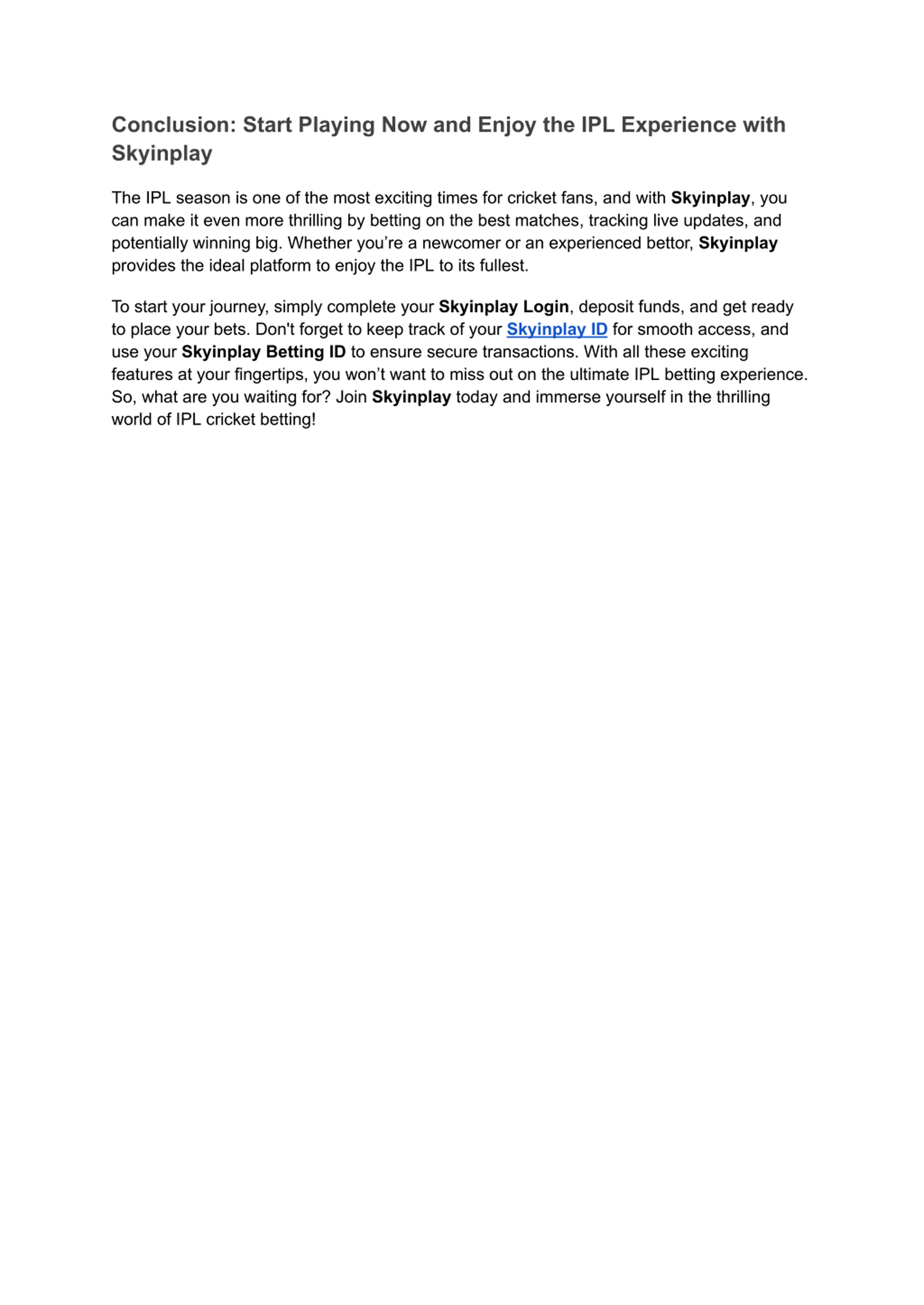 Conclusion: Start Playing Now and Enjoy the IPL Experience with Skyinplay The IPL season is one of the most exciting times for cricket fans, and with Skyinplay, you can make it even more thrilling by betting on the best matches, tracking live updates, and potentially winning big. Whether you re a newcomer or an experienced bettor, Skyinplay provides the ideal platform to enjoy the IPL to its fullest. To start your journey, simply complete your Skyinplay Login, deposit funds, and get ready to place your bets. Don't forget to keep track of your Skyinplay ID for smooth access, and use your Skyinplay Betting ID to ensure secure transactions. With all these exciting features at your fingertips, you won t want to miss out on the ultimate IPL betting experience. So, what are you waiting for? Join Skyinplay today and immerse yourself in the thrilling world of IPL cricket betting!