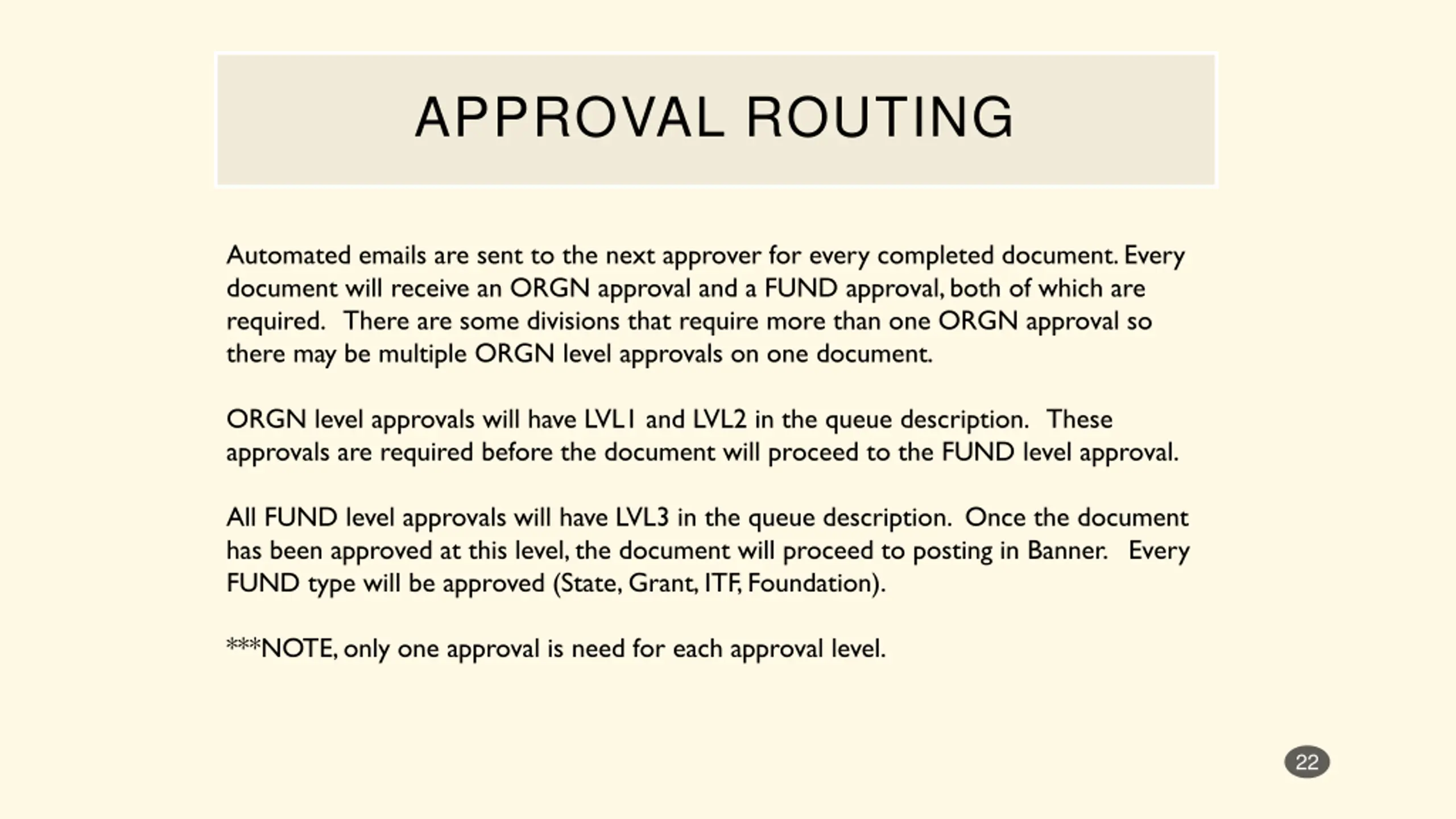 APPROVAL ROUTING Automated emails are sent to the next approver for every completed document. Every document will receive an ORGN approval and a FUND approval, both of which are required. There are some divisions that require more than one ORGN approval so there may be multiple ORGN level approvals on one document. ORGN level approvals will have LVL1 and LVL2 in the queue description. These approvals are required before the document will proceed to the FUND level approval. All FUND level approvals will have LVL3 in the queue description. Once the document has been approved at this level, the document will proceed to posting in Banner. Every FUND type will be approved (State, Grant, ITF, Foundation). ***NOTE, only one approval is need for each approval level. 22
