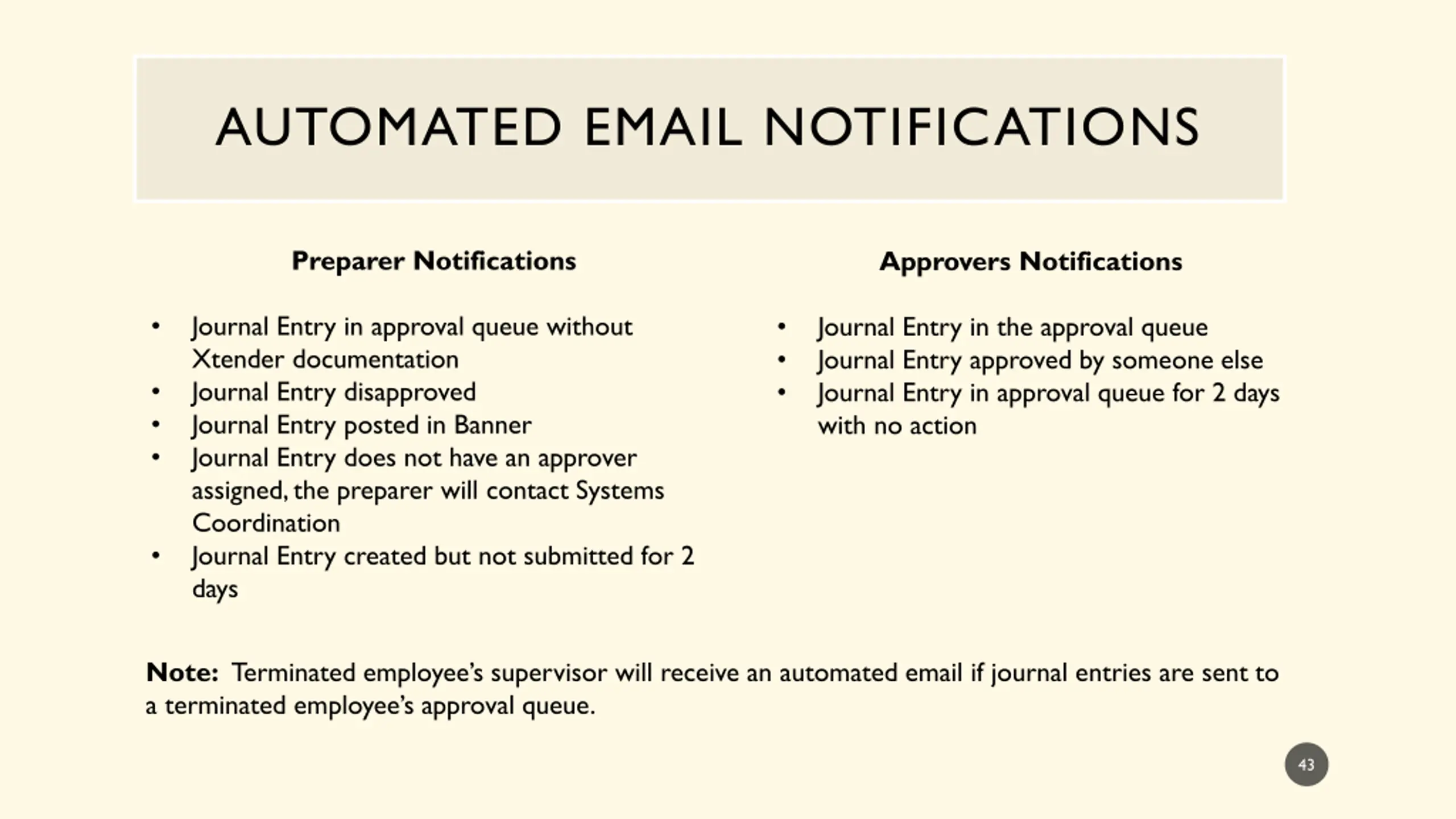 AUTOMATED EMAIL NOTIFICATIONS Preparer Notifications Approvers Notifications Journal Entry in approval queue without Xtender documentation Journal Entry disapproved Journal Entry posted in Banner Journal Entry does not have an approver assigned, the preparer will contact Systems Coordination Journal Entry created but not submitted for 2 days Journal Entry in the approval queue Journal Entry approved by someone else Journal Entry in approval queue for 2 days with no action Note: Terminated employee s supervisor will receive an automated email if journal entries are sent to a terminated employee s approval queue. 43