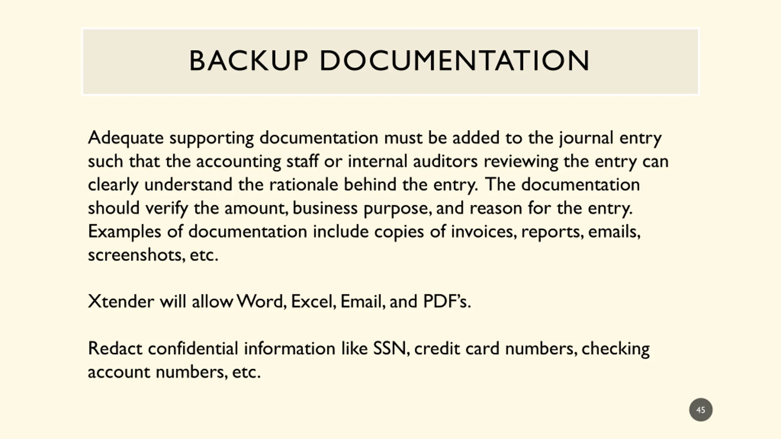 BACKUP DOCUMENTATION Adequate supporting documentation must be added to the journal entry such that the accounting staff or internal auditors reviewing the entry can clearly understand the rationale behind the entry. The documentation should verify the amount, business purpose, and reason for the entry. Examples of documentation include copies of invoices, reports, emails, screenshots, etc. Xtender will allow Word, Excel, Email, and PDF s. Redact confidential information like SSN, credit card numbers, checking account numbers, etc. 45