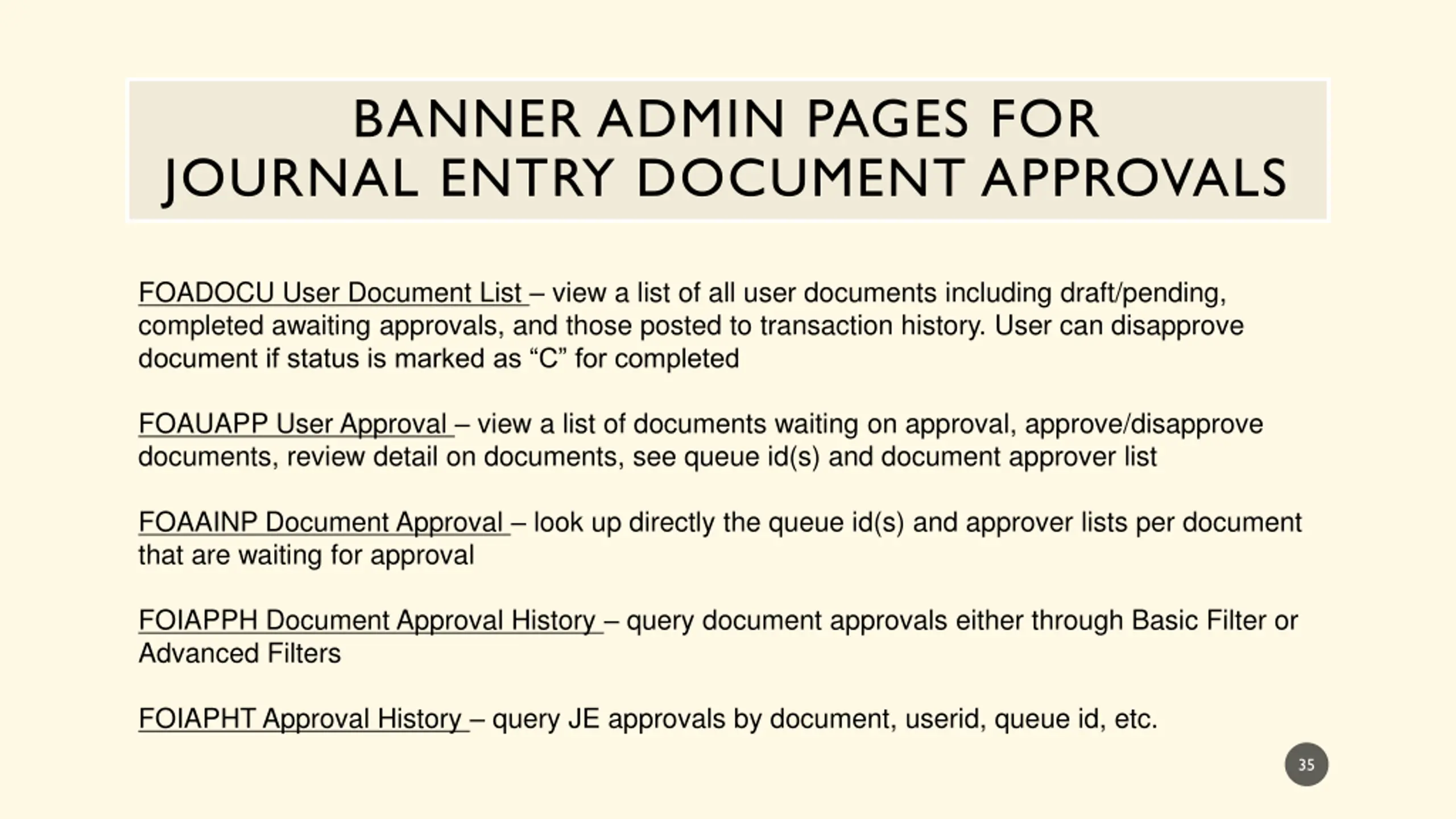 BANNER ADMIN PAGES FOR JOURNAL ENTRY DOCUMENT APPROVALS FOADOCU User Document List view a list of all user documents including draft/pending, completed awaiting approvals, and those posted to transaction history. User can disapprove document if status is marked as C for completed FOAUAPP User Approval view a list of documents waiting on approval, approve/disapprove documents, review detail on documents, see queue id(s) and document approver list FOAAINP Document Approval look up directly the queue id(s) and approver lists per document that are waiting for approval FOIAPPH Document Approval History query document approvals either through Basic Filter or Advanced Filters FOIAPHT Approval History query JE approvals by document, userid, queue id, etc. 35