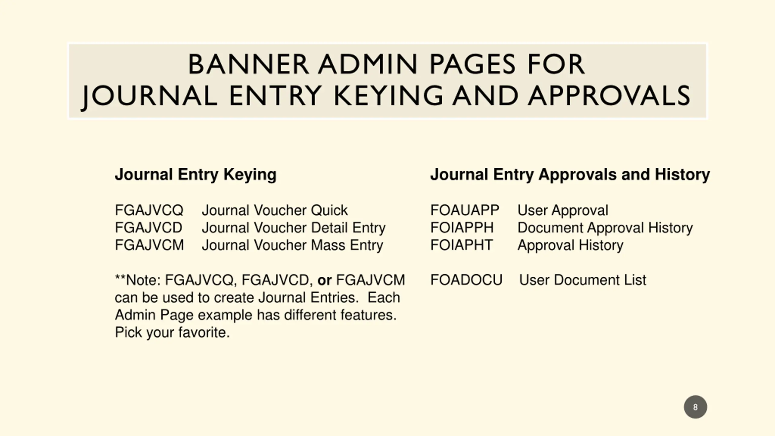 BANNER ADMIN PAGES FOR JOURNAL ENTRY KEYING AND APPROVALS Journal Entry Keying Journal Entry Approvals and History FGAJVCQ Journal Voucher Quick FGAJVCD Journal Voucher Detail Entry FGAJVCM Journal Voucher Mass Entry FOAUAPP FOIAPPH FOIAPHT User Approval Document Approval History Approval History FOADOCU User Document List **Note: FGAJVCQ, FGAJVCD, or FGAJVCM can be used to create Journal Entries. Each Admin Page example has different features. Pick your favorite. 8