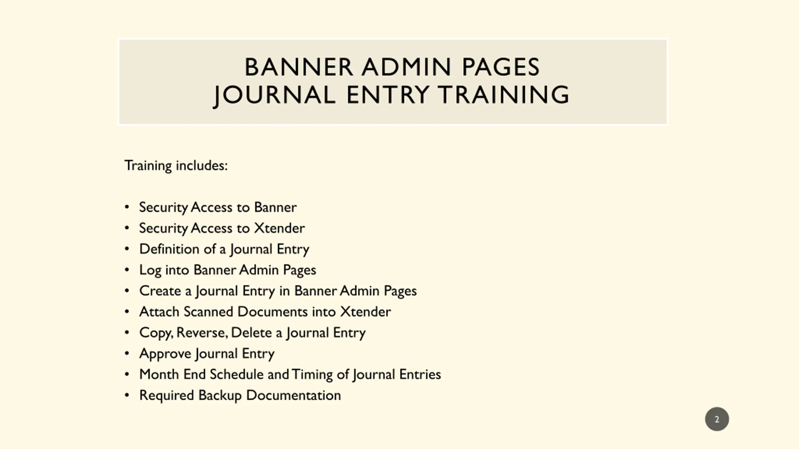 BANNER ADMIN PAGES JOURNAL ENTRY TRAINING Training includes: Security Access to Banner Security Access to Xtender Definition of a Journal Entry Log into Banner Admin Pages Create a Journal Entry in Banner Admin Pages Attach Scanned Documents into Xtender Copy, Reverse, Delete a Journal Entry Approve Journal Entry Month End Schedule and Timing of Journal Entries Required Backup Documentation 2