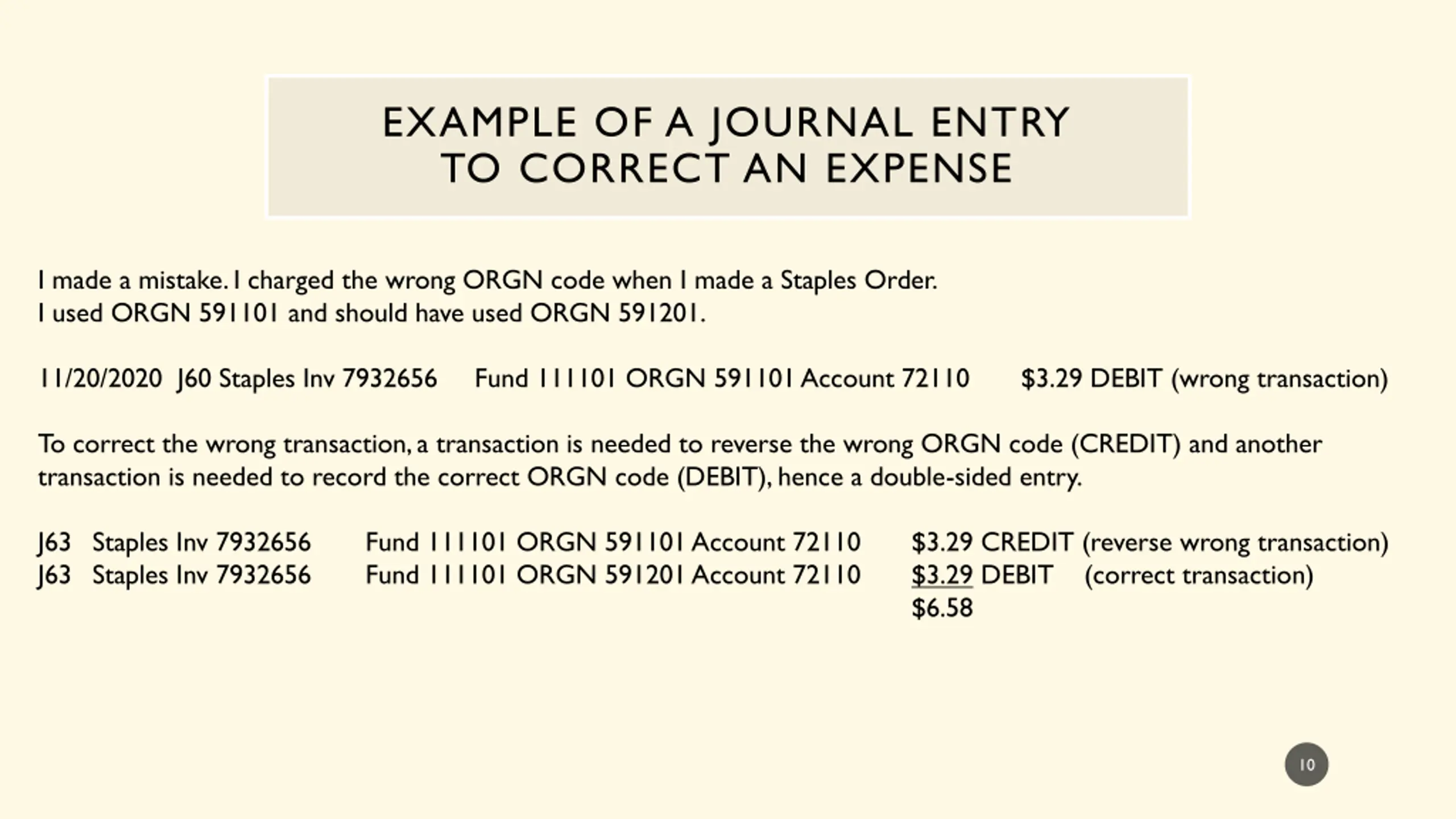 EXAMPLE OF A JOURNAL ENTRY TO CORRECT AN EXPENSE I made a mistake. I charged the wrong ORGN code when I made a Staples Order. I used ORGN 591101 and should have used ORGN 591201. 11/20/2020 J60 Staples Inv 7932656 Fund 111101 ORGN 591101 Account 72110 $3.29 DEBIT (wrong transaction) To correct the wrong transaction, a transaction is needed to reverse the wrong ORGN code (CREDIT) and another transaction is needed to record the correct ORGN code (DEBIT), hence a double-sided entry. J63 Staples Inv 7932656 J63 Staples Inv 7932656 Fund 111101 ORGN 591101 Account 72110 Fund 111101 ORGN 591201 Account 72110 $3.29 CREDIT (reverse wrong transaction) $3.29 DEBIT (correct transaction) $6.58 10