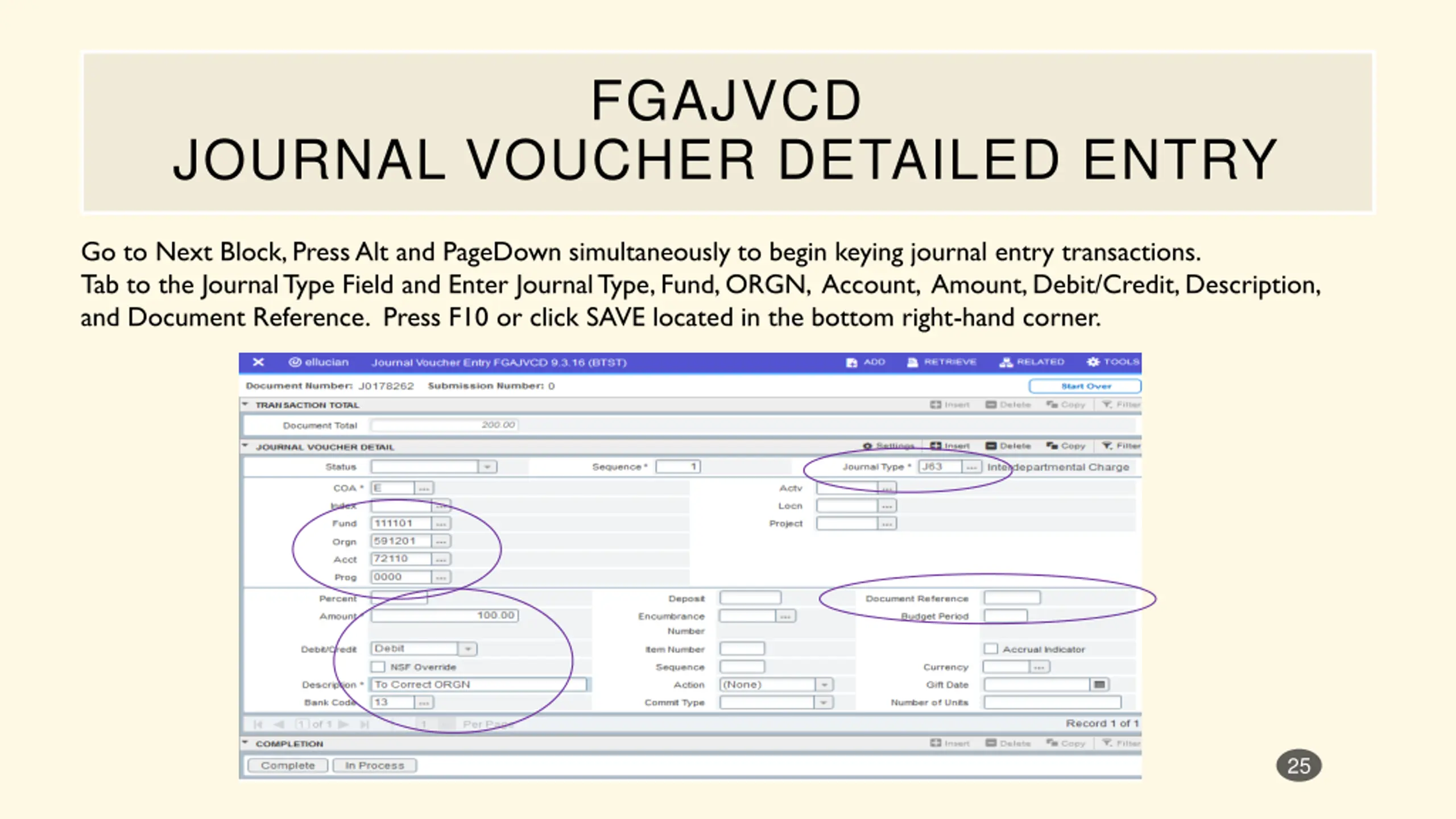 FGAJVCD JOURNAL VOUCHER DETAILED ENTRY Go to Next Block, Press Alt and PageDown simultaneously to begin keying journal entry transactions. Tab to the Journal Type Field and Enter Journal Type, Fund, ORGN, Account, Amount, Debit/Credit, Description, and Document Reference. Press F10 or click SAVE located in the bottom right-hand corner. 25