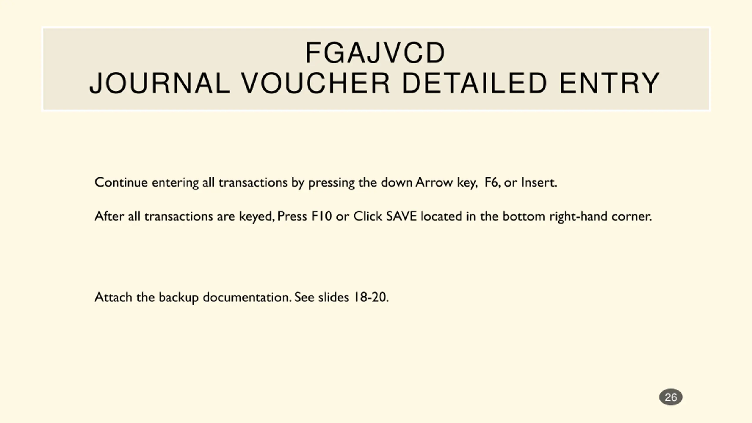 FGAJVCD JOURNAL VOUCHER DETAILED ENTRY Continue entering all transactions by pressing the down Arrow key, F6, or Insert. After all transactions are keyed, Press F10 or Click SAVE located in the bottom right-hand corner. Attach the backup documentation. See slides 18-20. 26